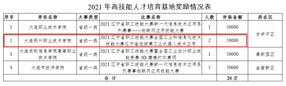 近日,大连市人力资源社会保障局公布了2021年度国家、省级一类大赛获奖选手及选送单位奖励情况,学院获批为“大连市高技能人才培育基地”,同时获得5万元高技能人才成长奖励资金。