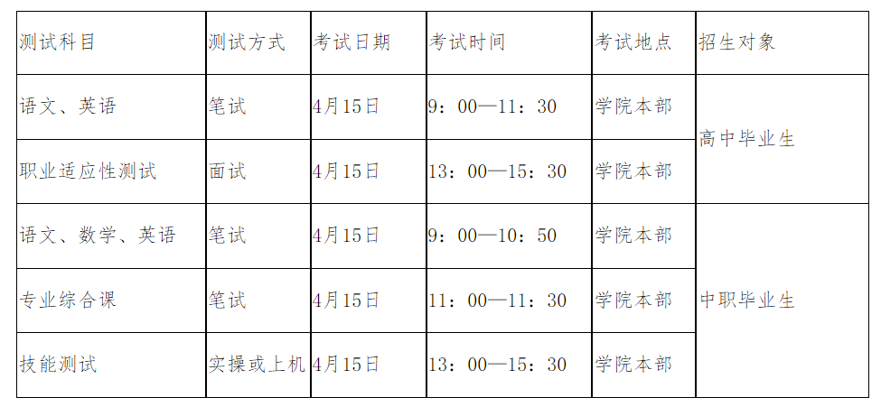 (1)考核分为“文化课+专业综合课+技能测试”三部分。文化课和专业综合课的考核方式为笔试,考试科目为语文、英语、