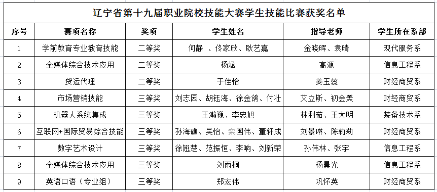 近日,辽宁省第十九届职业院校技能大赛学生技能比赛获奖名单公布,我校共9个参赛队获奖,其中二等奖3个,三等奖6个,恭喜各位获奖的老师和同学!