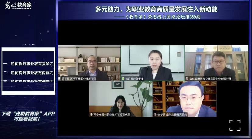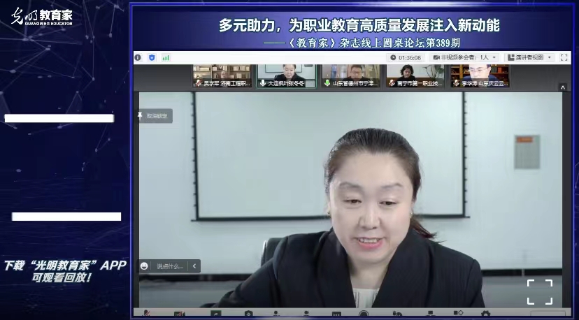党的二十大报告指出,统筹职业教育、高等教育、继续教育协同创新,推进职普融通、产教融合、科教融汇,优化职业教育类型定位,为职业教育发展注入新动能。4月25日,学院教务处处长张冬冬受邀主持光明日报《教育家》杂志线上圆桌论坛,本次会议以如何提升职业教育竞争力、内驱力、创新力为题开展交流分享。