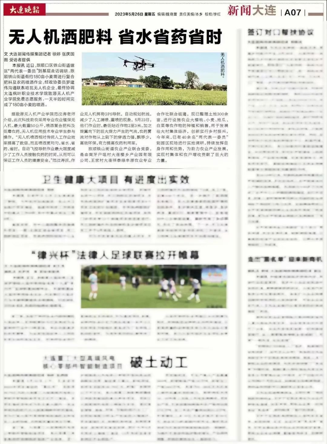 5月25日,大连晚报、半岛晨报多家媒体通过报刊、短视频等形式报道了大连枫叶职业技术学院致源无人机产业学院运用无人机技术,帮助农户施肥撒药事件,有力提升学院服务社会美誉度和影响力。