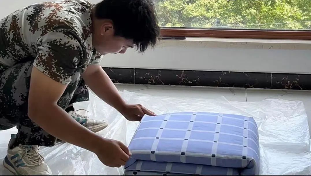 所有选手蓄势待发,比赛开始,参赛选手迅速进入比赛状态,铺平、压实、翻折、抠角、捏线,简单的动作重复多次,整齐方正的被子迅速成型。选手们争分夺秒,各显神通,通过“折、压、磨、捏、修”等一系列动作来给自己的“豆腐块”凹造型。