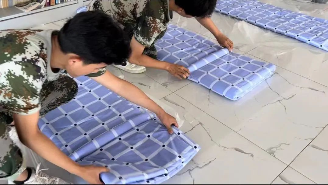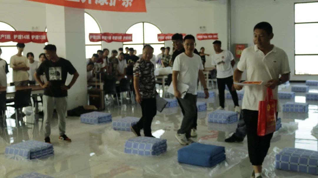 一床床整齐方正、棱角分明的“豆腐块”呈现在面前,展示了学生们日常的训练水平。随后各位评委通过对参赛选手的被子平整度、整体美观度、尺寸、边线棱角和整体效果等认真评比,将手中的奖状颁发给最标准的“豆腐块”。