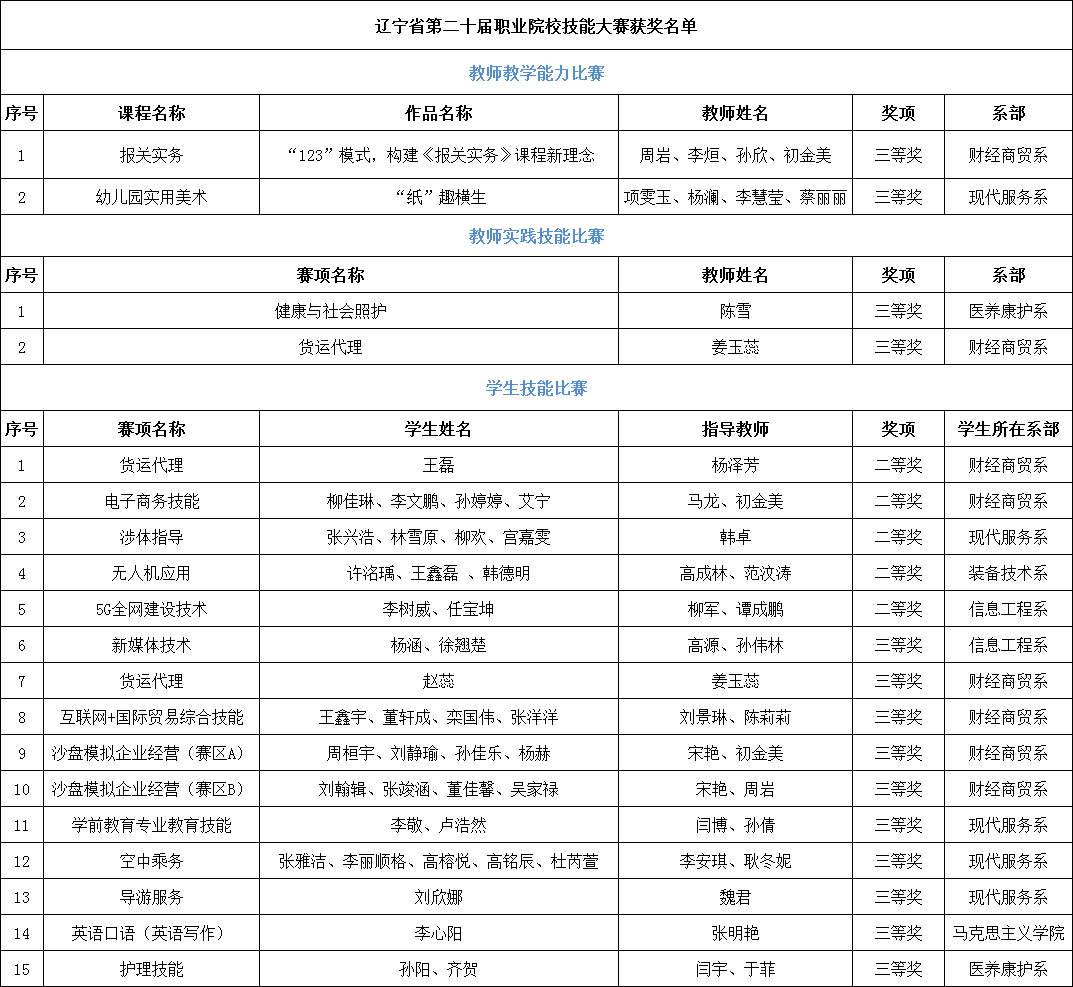 近日,辽宁省教育厅公布了《辽宁省教育厅关于对辽宁省第二十届职业院校技能大赛获奖情况的公示》,学院共获奖19项。其中,教师教学能力比赛获三等奖2项;教师实践技能比赛获三等奖2项;学生技能比赛获奖15项,包括二等奖5项,三等奖10项。恭喜各位获奖的老师和同学!