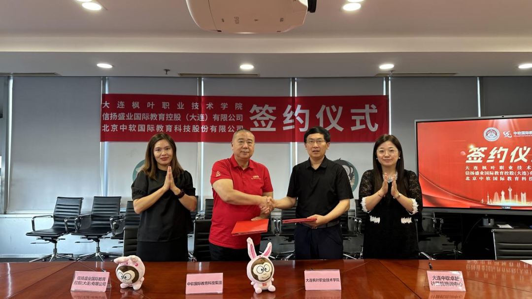 07月6日,大连枫叶职业技术学院、信扬盛业国际教育控股(大连)有限公司与北京中软国际教育科技股份有限公司举行校企合作签约仪式,进一步深化校企合作交流,推进学校和企业协同创新发展。