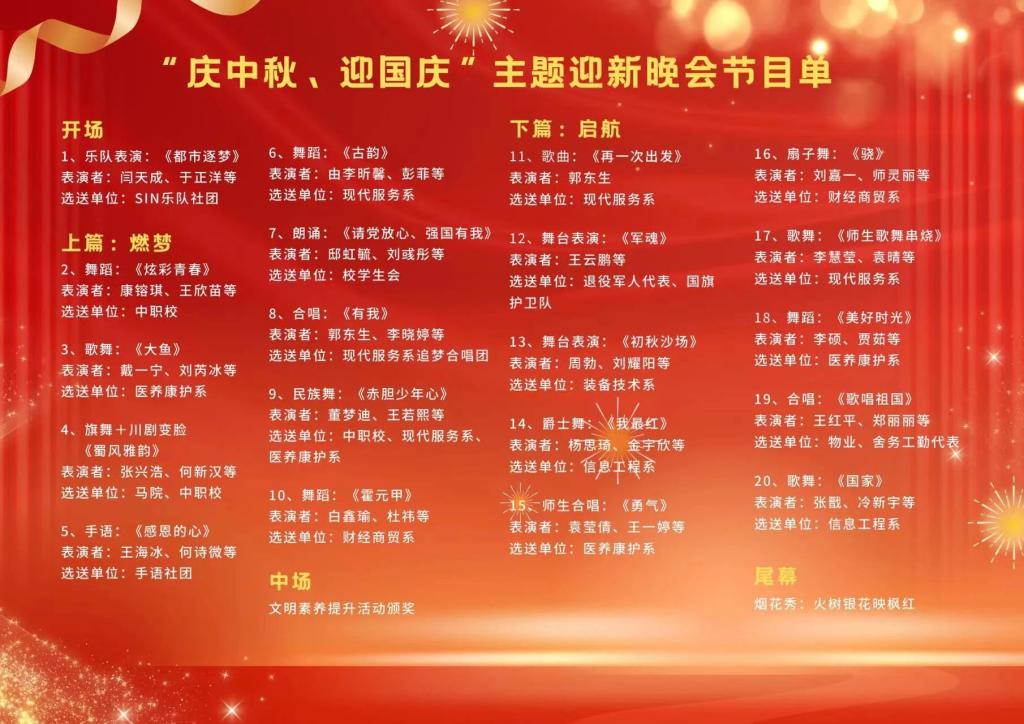 素质教育的硕果展示,喜迎新生的蓄势待发,中秋佳节的团圆情谊,国庆华诞的骄傲时刻,一场精彩的晚会正式拉开帷幕。在这个充满活力与传统交织的时刻,枫叶学子们齐聚一堂,以独特的方式庆祝并彰显多彩的校园生活。这场绚烂多彩的晚会为观众呈现了一场精心策划的盛宴,将素质学期的成果、新生的期待、中秋的浪漫、国庆的自豪融为一体,为校园增添了一抹绚丽的色彩。