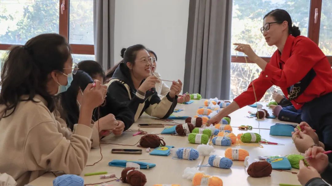 大家积极尝试使用钩针,练习基础钩针技巧,交流钩编的方法和步骤。色彩斑斓的绒线在指尖飞快地穿梭,形成一片片美丽的织布。