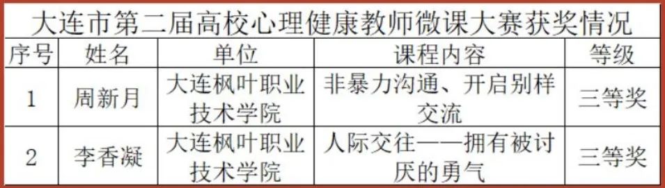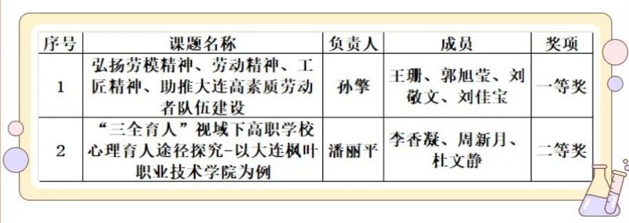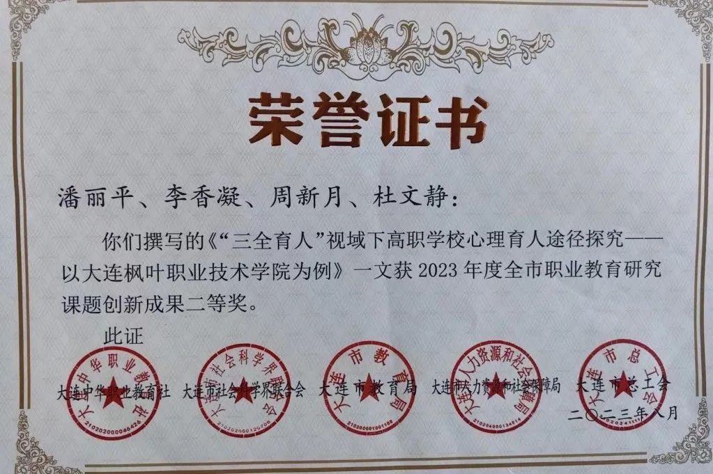 为增强科研能力,激励先进,按照《大连市职业教育研究课题评审奖励办法》,在完成结项的60项课题中,经专家组评审,市职教社、市社科联、市教育局、市人社局、市总工会研究由大连中华职教社主任办公会核准,大连枫叶职业技术学院马克思主义学院荣获一等奖1项、二等奖1项。