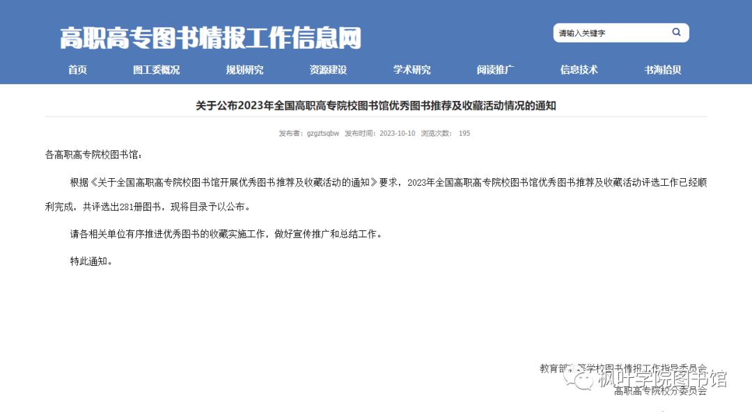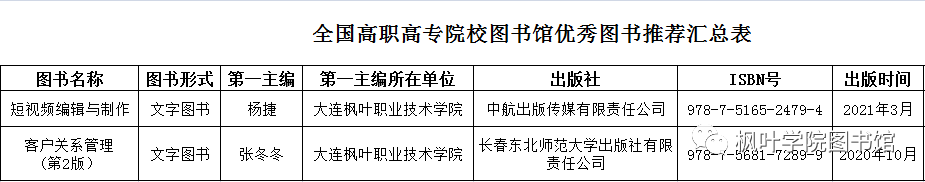 由教育部高等学校图书情报工作指导委员会高职高专院校分委员会组织的2023年全国高职高专院校图书馆优秀图书推荐及收藏活动评选工作已经顺利完成,共评选出281册图书,我馆推荐的图书《短视频编辑与制作》和《客户关系管理(第2版)》获评优秀图书。