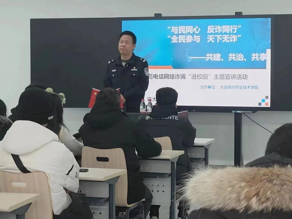 为进一步营造浓厚的防诈骗宣传氛围,提升师生的防范意识,增强师生对电信网络诈骗的识别和应对能力,有效预防和遏制电信网络违法犯罪,守护广大师生财产安全。2023年12月20日下午15:00,在4号教学楼409多媒体教室,学院邀请大黑石沿海派出所陈大鹏警官为学生干部做了“与民同心、反诈同行”专题教育,学生处/保卫处吕运福老师及56名学生干部参加培训。