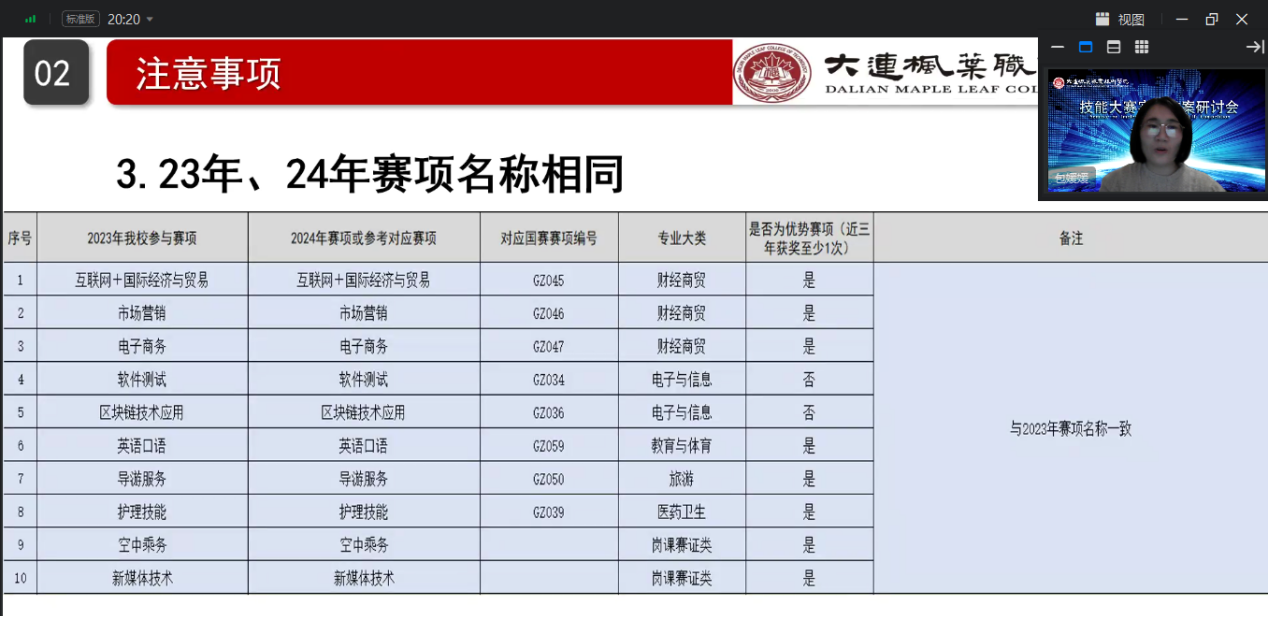 包媛媛老师将近三年比赛赛项和获奖成绩进行了梳理,将本年度的赛项与往年赛项做了对比分析,重点标注出相似赛项和新增赛项,便于了解我院优势赛项和弱势赛项,为参赛赛项的决策和训练计划的制定提供了有力的数据支撑。同时,积极与省厅沟通,对“教师合赛”等赛项名词做了准确解读。