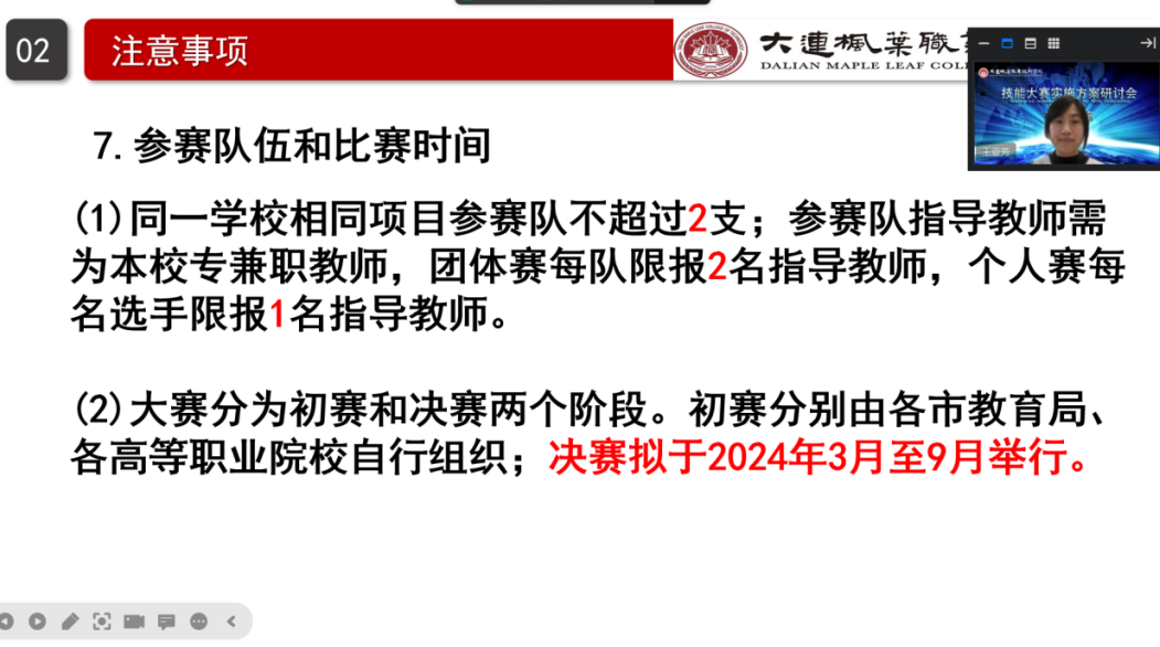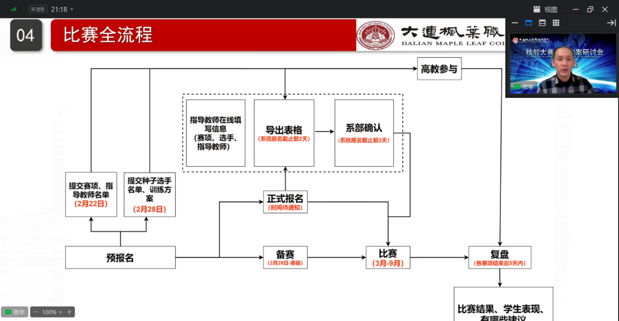 张宇副主任使用逻辑图的方式对比赛报名、备赛和正式比赛的全流程进行梳理,明确各环节工作重点、时间节点和质量要求。标准化工作流程有利于理清工作思路、提高工作效率。