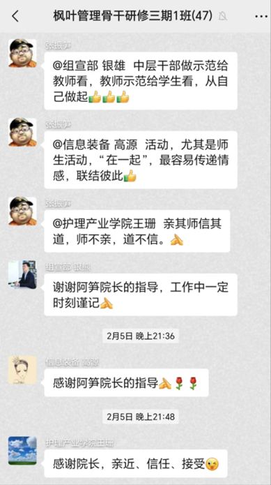 “暮省”,即通过每日复盘,提升思考力。对每日工作、生活内容进行复盘(梳理、回顾当日的收获与不足),每天晚上22点前将复盘内容分享到班级微信群进行打卡交流,贵在深度思考、思有所悟,与日常工作、生活建立联结。