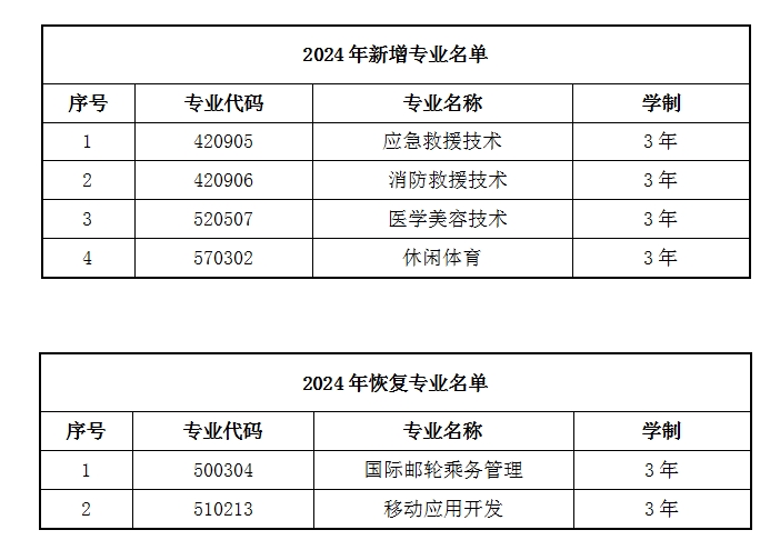近日,辽宁省教育厅发布了《关于公布2024年高职专科新增非国控专业和撤销专业名单的公示》,我院申报的应急救援技术、消防救援技术、医学美容技术和休闲体育4个新增高职专业成功获批,另有2个专业恢复招生,截至目前,我院的高职专业总数达到50个。