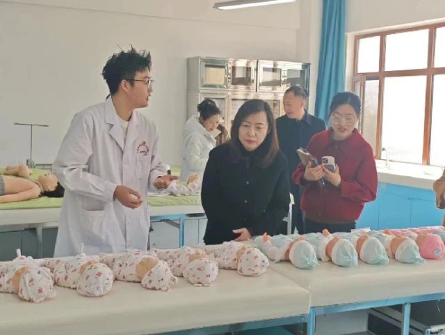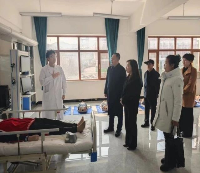 随后,领导们来到了护理实训室。在这里,学生们热情地向领导们介绍了实训室的布局、功能以及日常实训内容。领导们参观了模拟病房、护理技能操作室以及急救训练区,对学生们的专业能力和实训室的设施表示了高度认可。