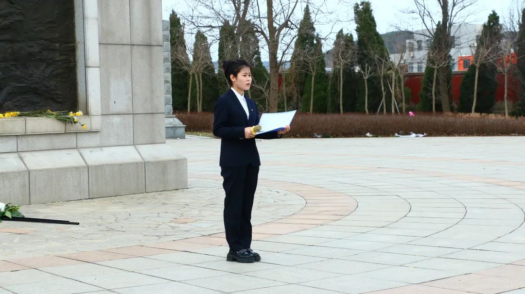 学院代表们矗立在纪念碑前,由学生代表朗诵悼词,表达了对革命烈士的沉痛哀悼和深切思念之情。