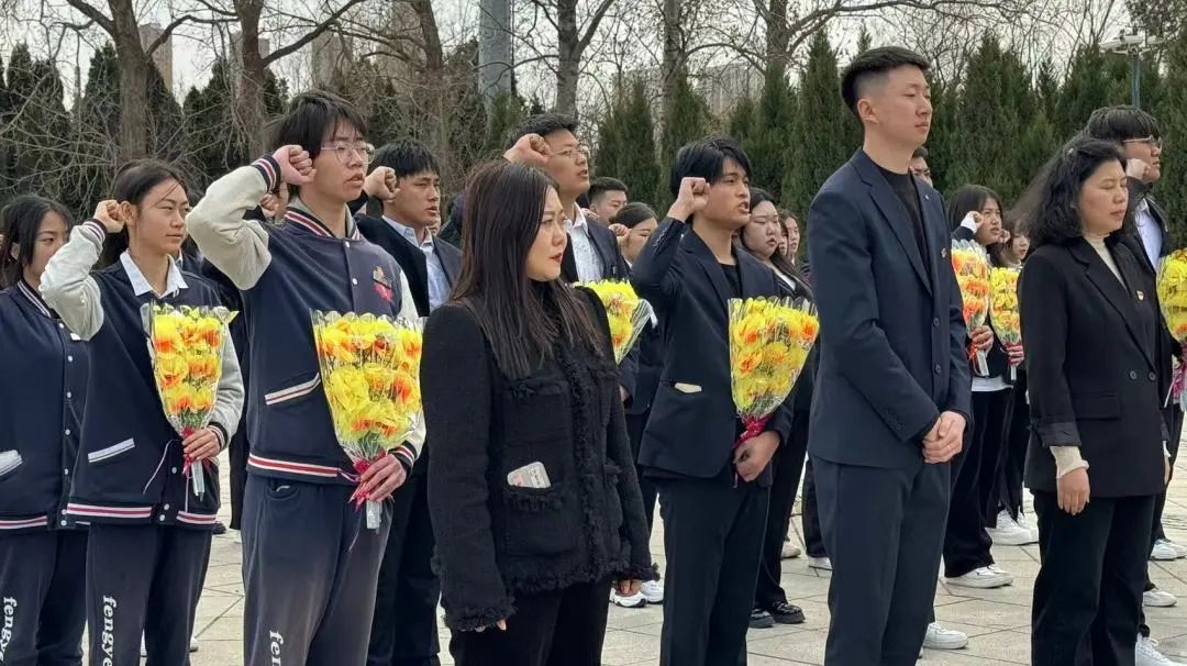 全体师生齐声奏唱国歌,嘹亮的歌声在陵园中回荡。