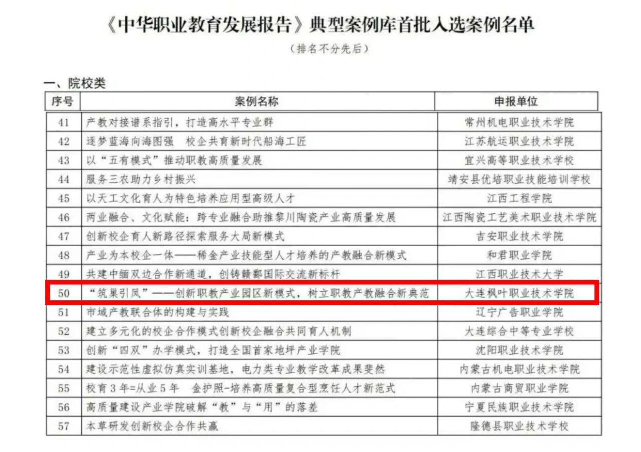 近日,中华职业教育社公布了《中华职业教育发展报告》典型案例库首批入选案例名单,其中,我院《“筑巢引凤”--创新职教产业园区新模式,树立职教产教融合新典范》案例成功入选。