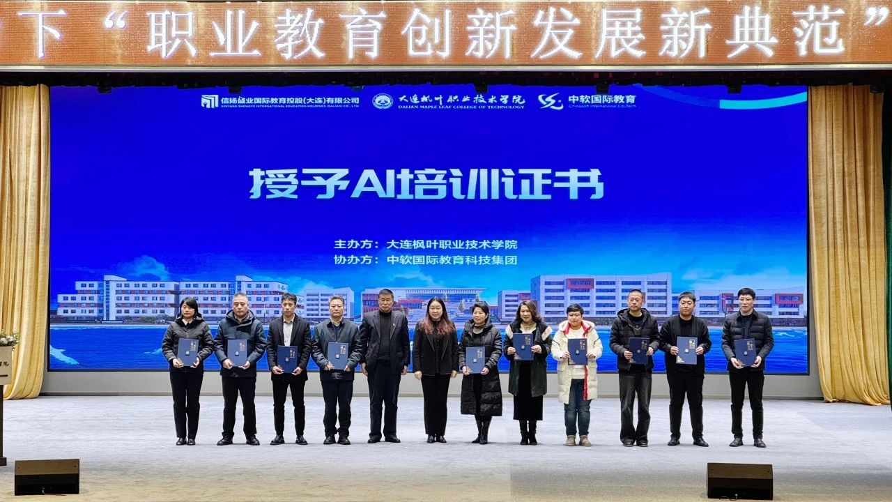 仪式结束后,学院特别安排了“智能跃迁,AI赋能”培训环节,由学院品牌发展部、信息中心主任薛飞担任主讲。薛飞主任凭借深厚的专业知识与丰富的实践经验,深入浅出地讲解了人工智能领域的前沿知识与实践应用技巧,内容丰富详实、精彩纷呈。培训结束后,由大连枫叶职业技术学院副院长张冬冬,智能互联网产业学院院长袁福庆为代表颁发培训结业证书。