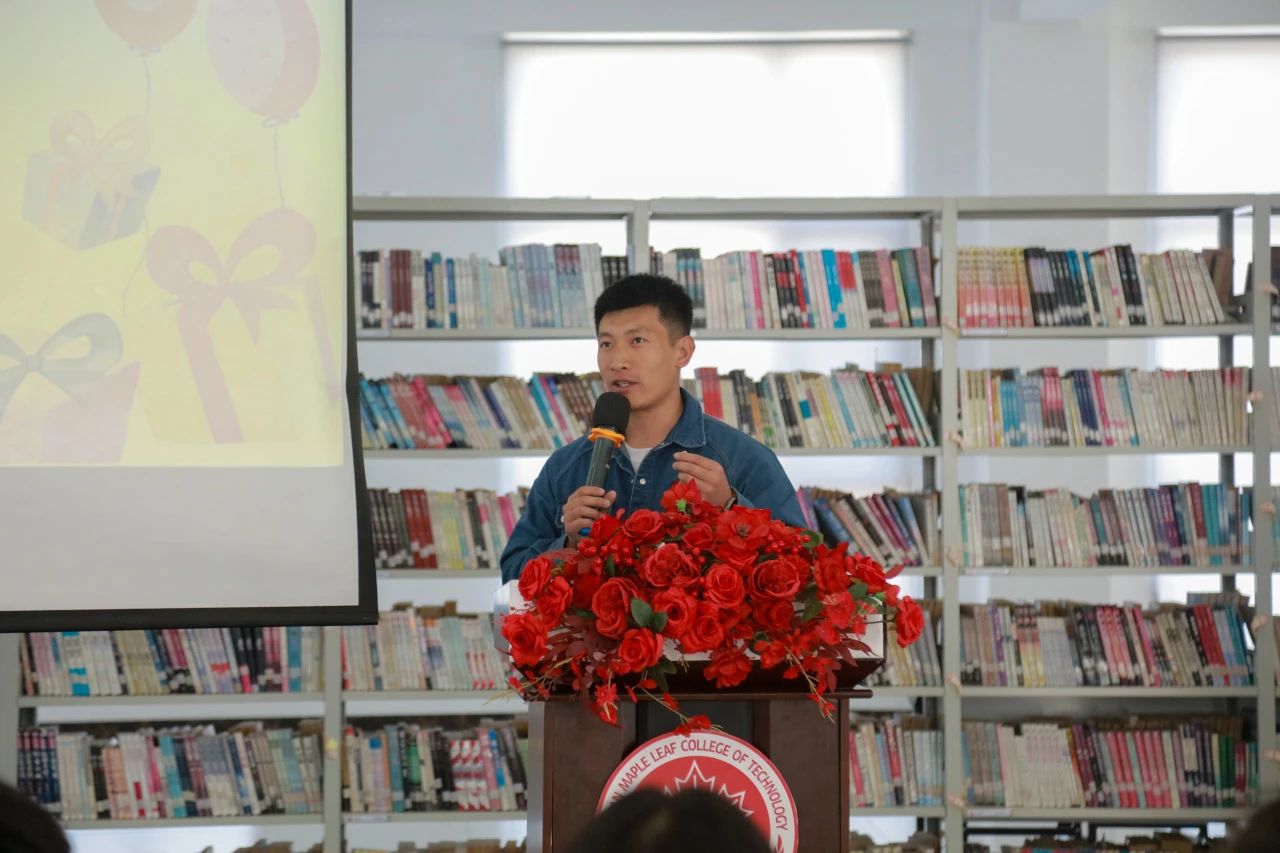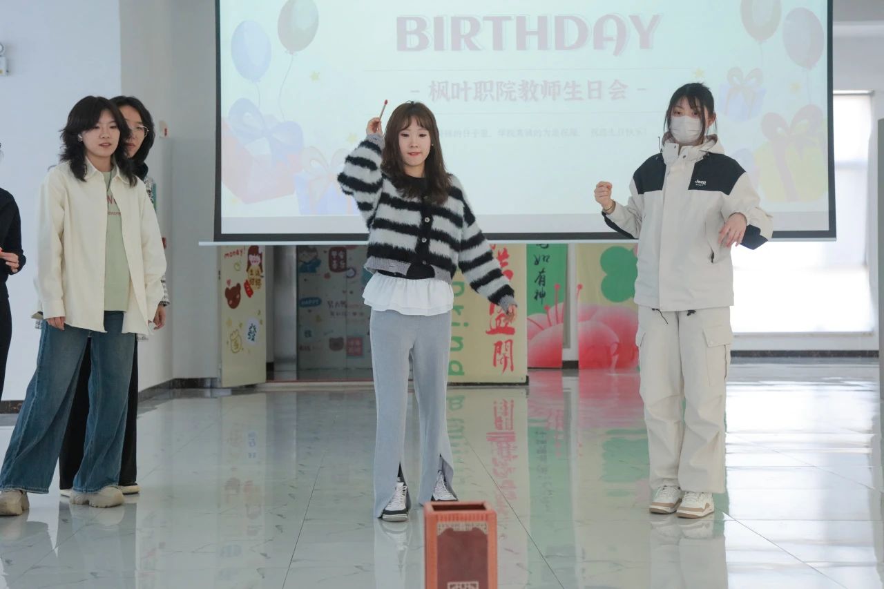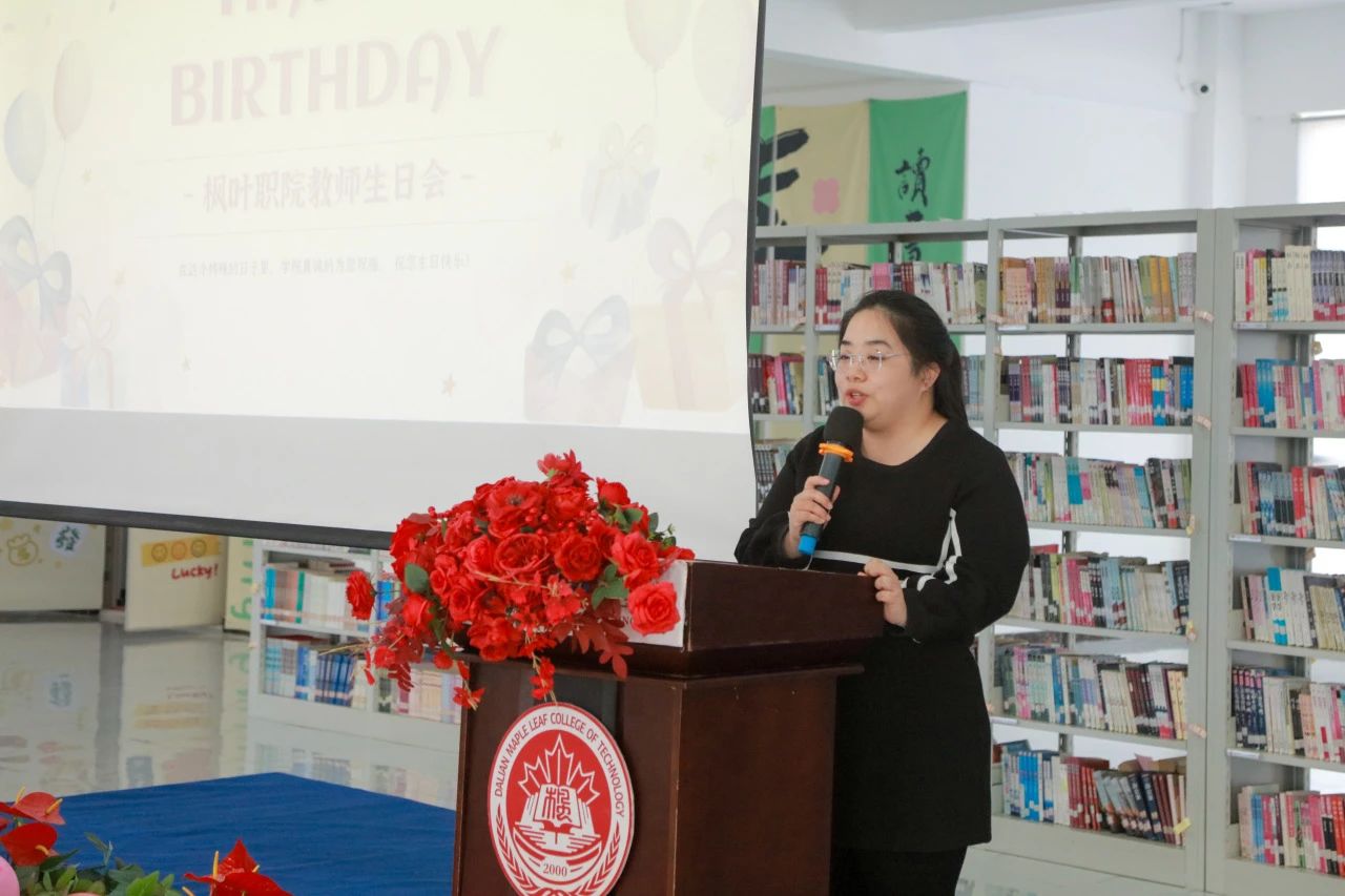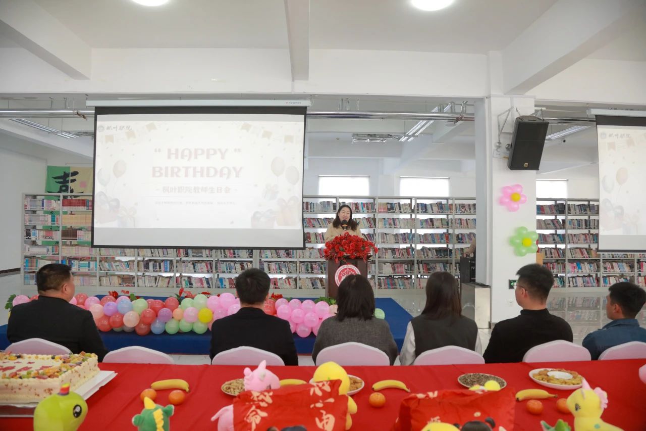 与此同时,大黑石校区的活动也同步开展。副院长张冬冬上台发言,她对教职工们的辛勤付出表达了诚挚感谢,强调学院一直致力于为大家营造良好的工作环境与氛围,希望通过生日会这样的活动,让教职工们感受到学院大家庭的温暖,激励大家以更饱满的热情投入到教育事业中。