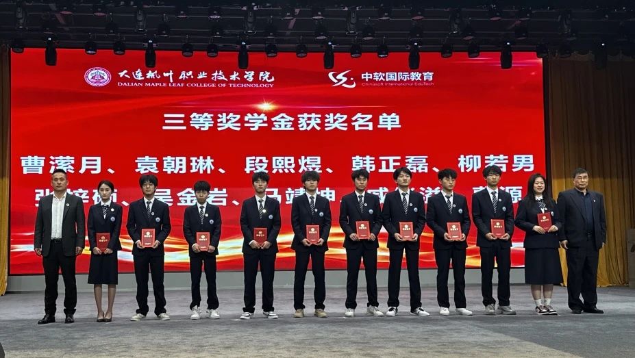 讲座结束后,活动进入第二阶段——2024-2025学年第一学期奖学金及优秀学生干部、先进个人荣誉证书颁发仪式。智能互联网产业学院教学副院长阎树昕宣读了获奖名单,随后,中软国际教育科技集团高级副总裁李佳历、大连枫叶职业技术学院张冬冬副院长、高成林副院长、等领导分别为获得奖学金的同学以及先进个人和优秀学生干部颁奖。获奖同学们脸上洋溢着自豪的笑容,手捧荣誉证书,合影留念,记录下这难忘的瞬间。