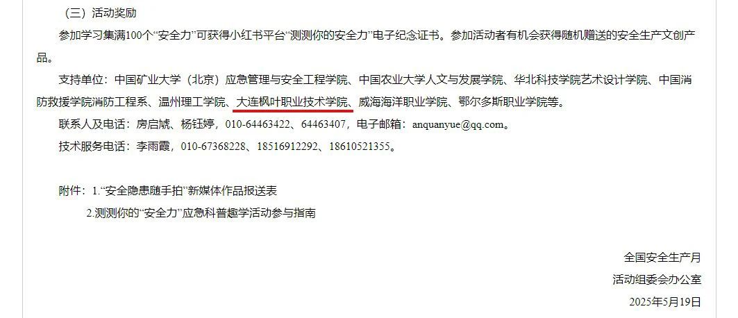 学院在《关于开展“安全隐患随手拍”新媒体作品征集、测测你的“安全力”应急科普趣学活动的通知》(安委办〔2025〕5号)中,被列为支持单位。这不仅是对我院工作的认可,更是激励我院持续发力,为构建安全防护体系贡献枫叶力量。