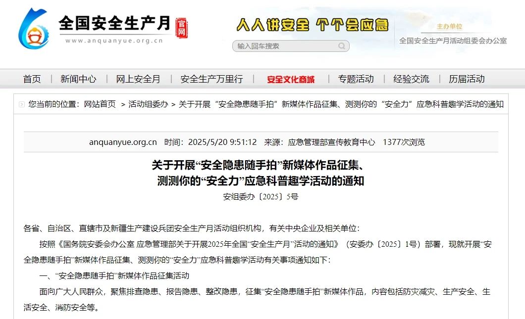 后续,我院还将积极参与“安全隐患随手拍”新媒体作品征集活动。该活动面向广大人民群众,聚焦排查隐患、报告隐患、整改隐患,征集“安全隐患随手拍”新媒体作品,内容包括防灾减灾、生产安全、生活安全、消防安全等。我院将充分发挥专业优势,鼓励师生从身边入手,发现并记录安全隐患,通过新媒体作品的创作与传播,提升公众对安全隐患的认知与重视,营造全社会关注安全的良好氛围。