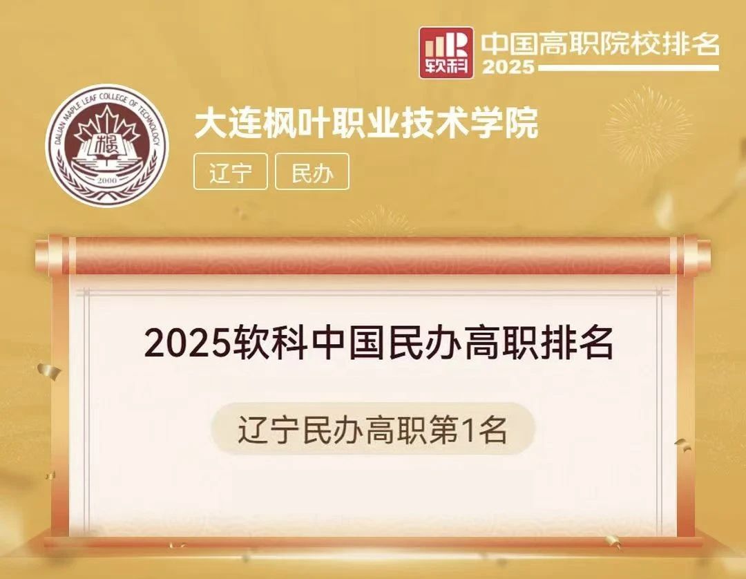 近日,高等教育专业评价机构软科正式发布“2025软科中国大学排名”,大连枫叶职业技术学院位列辽宁民办高职第1名。自2023年该排名发布以来,学院已连续三年蝉联辽宁民办高职第1名。
