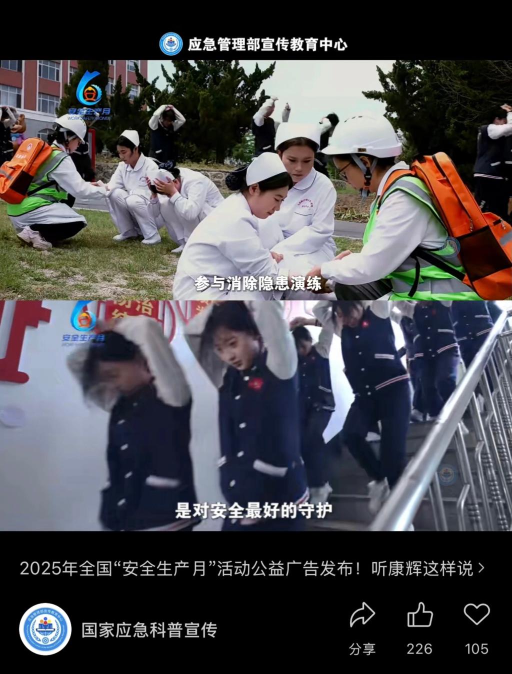 近日,2025年全国“安全生产月”活动公益广告相继推出,我院参与开展防震抗震应急演练的片段在其中精彩呈现。演练过程中,师生们以规范的动作、迅速的反应,将日常积累的安全知识高效转化为实践能力,生动展现了我院在安全生产教育工作中的积极探索与深度实践。