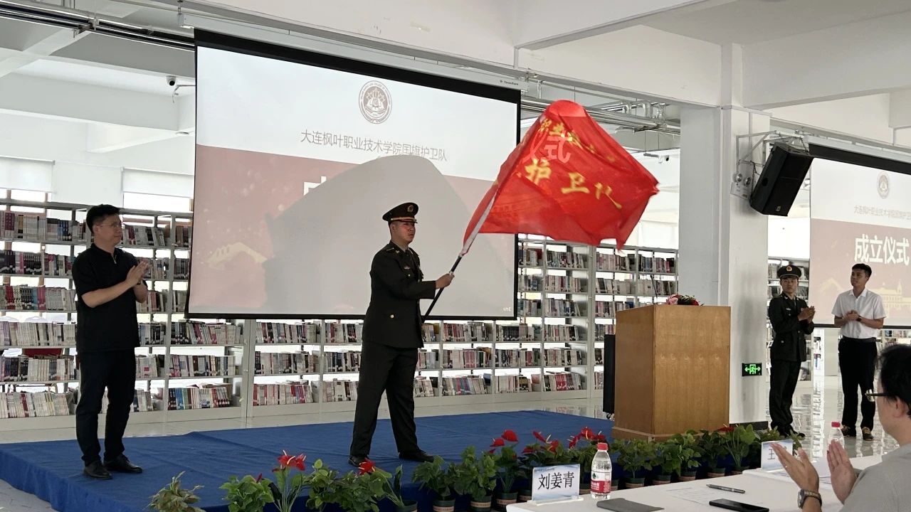 学生工作处处长王博宣读关于《成立大连枫叶职业技术学院国旗护卫队的决定》文件,详细阐明队伍组织架构、职责使命。随后,他向队长陈志鹏郑重授出队旗,鲜红的旗帜在会场中展开,标志着国旗护卫队正式肩负起守护国旗、传承爱国精神的使命。