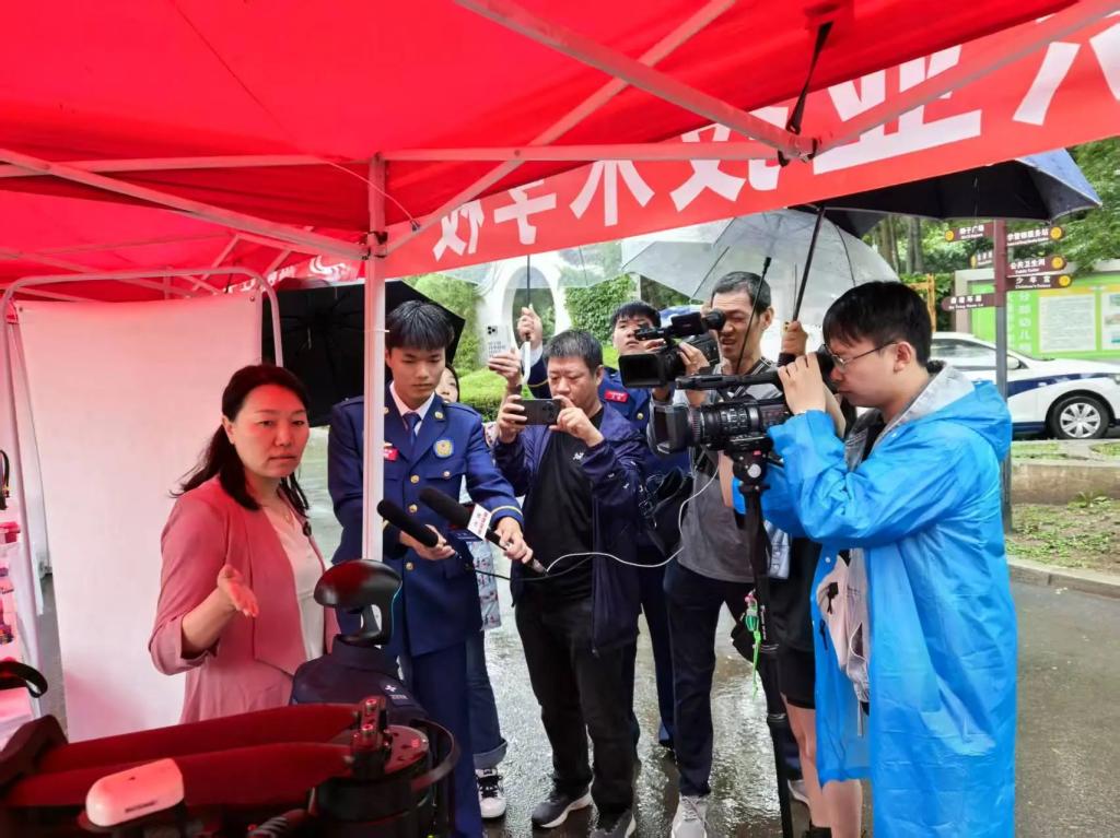 电视台记者也冒雨来到展位进行深入采访。我院安全应急管理产业学院院长刘阳威在雨中详细介绍了应急专业与科技融合的教学成果,以及在人才培养、技术创新等方面的实践探索。