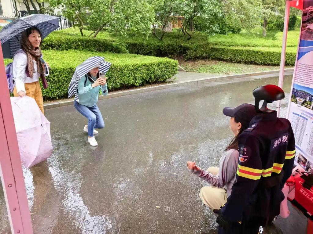 活动现场,雨水冲刷着地面,却冲不散人们的热情。市民们撑着雨伞、披着雨衣纷至沓来,我院展位前更是热闹非凡。展位上,传统应急处置设备与前沿科技交相辉映:具身智能机器人在雨中模拟灾害场景下的救援行动,低空经济设备展示安全监测与应急物资投送功能,这些将科技与安全相结合的创新成果,引得市民纷纷驻足围观、拍照打卡。