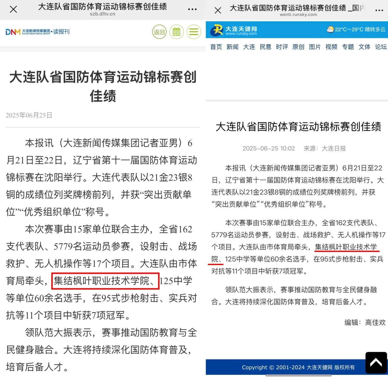 2025年6月21日至22日,辽宁省第十一届国防体育运动锦标赛在沈阳圆满落幕。由大连枫叶职业技术学院国防教育办公室主任范大振带队,我院参赛团队以昂扬的斗志和精湛的技艺,在赛场上大放异彩,斩获多项荣誉,充分彰显了学院国防体育教育的卓越成果。
