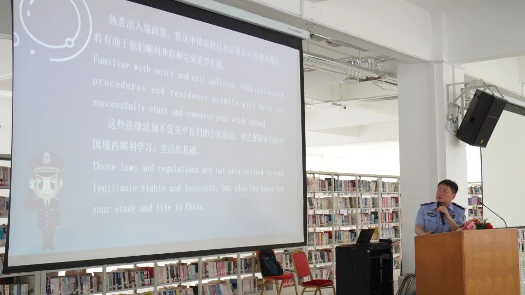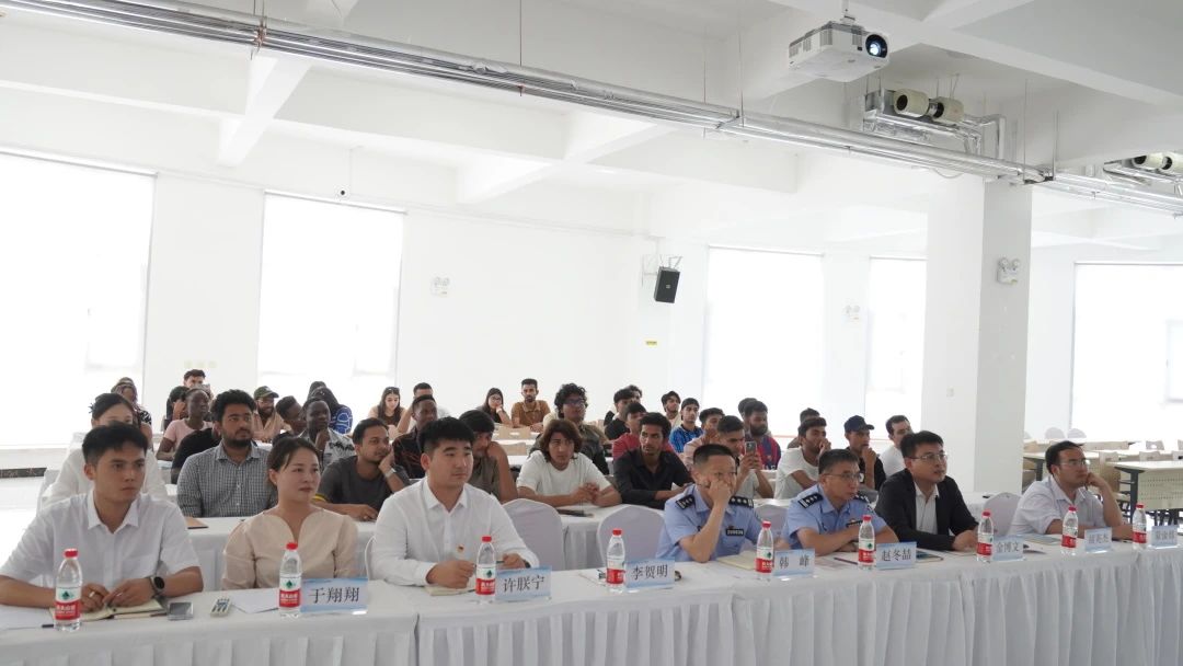 为强化来华留学生法治观念,保障其在中国安心求学,2025年7月7日,学院联合大连市公安局出入境管理局举办"留学生法律护航行动"专题讲座。市出入境管理局韩峰、李贺明、赵冬喆三位警官受邀担任主讲,为40余名国际学生开展沉浸式普法教育。一同参加本次普法教育的还有继续教育与国际合作交流学院国际部主任金博文、国际部教学主任于翔翔、国际部包苏敏、吴琼,学生处许朕宁、鲁星辰,留学生辅导员蒙淦炜,留学生管理胡英杰老师。
