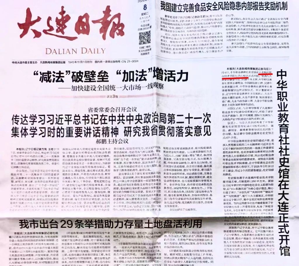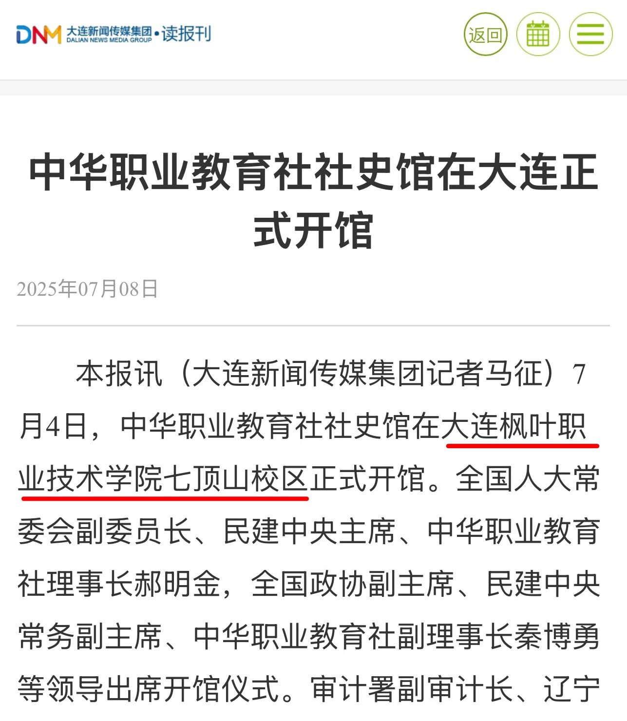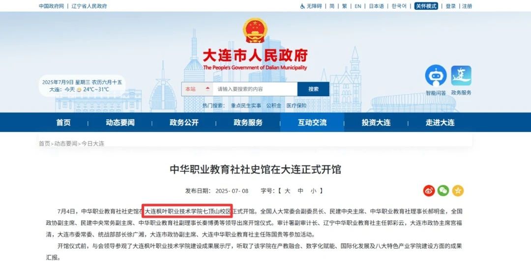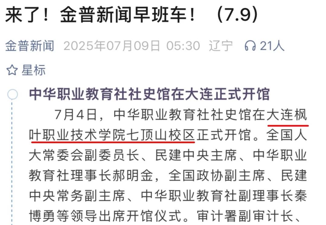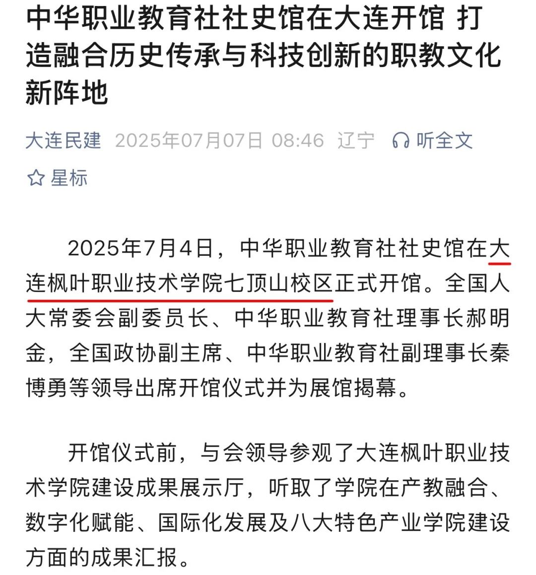 7月4日,中华职业教育社社史馆在大连枫叶职业技术学院七顶山校区正式开馆。此次活动受到中国新闻、北斗融媒、辽宁统战、大连统一战线、辽宁中华职业教育社、大连市人民政府官网、大连新闻、大连日报、金普新闻、大连民建、大连市图书馆等多家媒体的关注与报道,既彰显了本次活动的重要性,也体现了对我院相关工作的高度肯定与认可。
