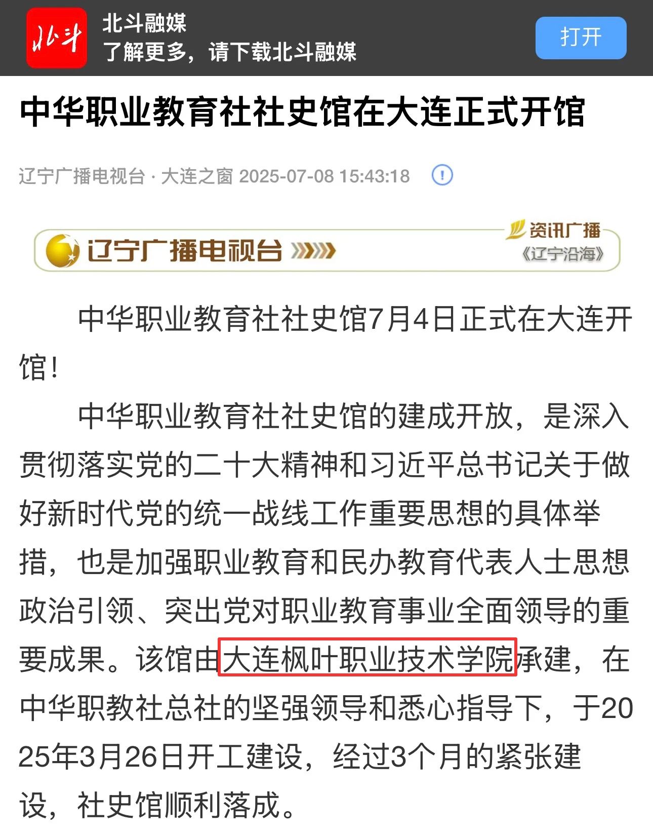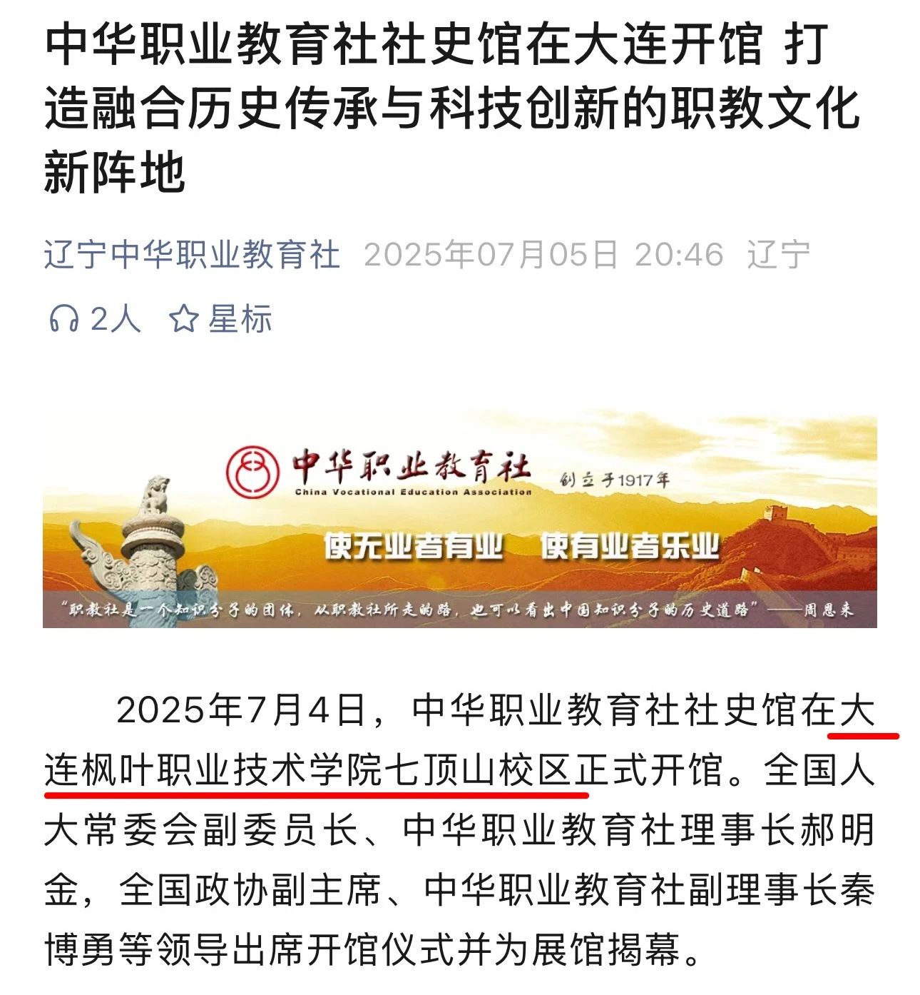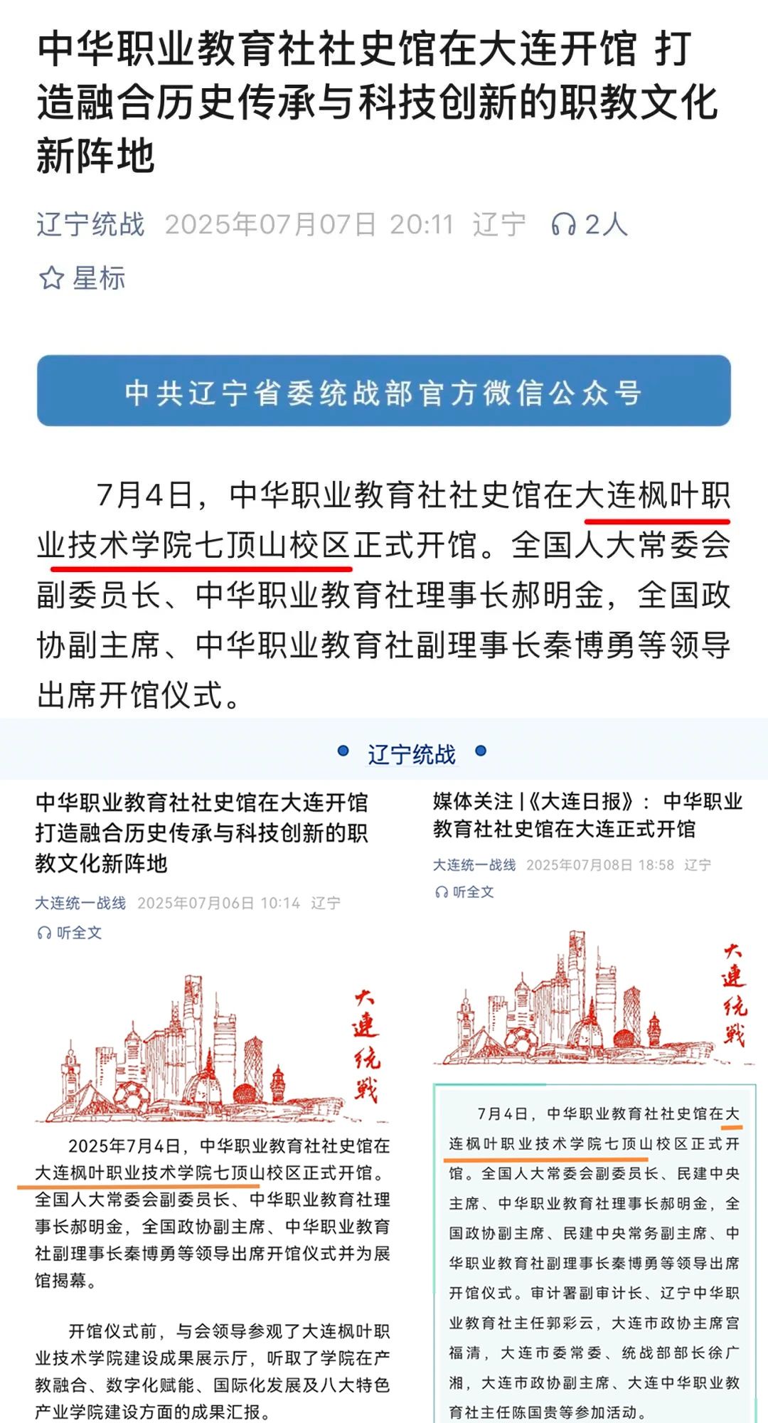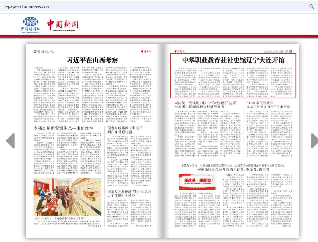 7月4日,中华职业教育社社史馆在大连枫叶职业技术学院七顶山校区正式开馆。此次活动受到中国新闻、北斗融媒、辽宁统战、大连统一战线、辽宁中华职业教育社、大连市人民政府官网、大连新闻、大连日报、金普新闻、大连民建、大连市图书馆等多家媒体的关注与报道,既彰显了本次活动的重要性,也体现了对我院相关工作的高度肯定与认可。