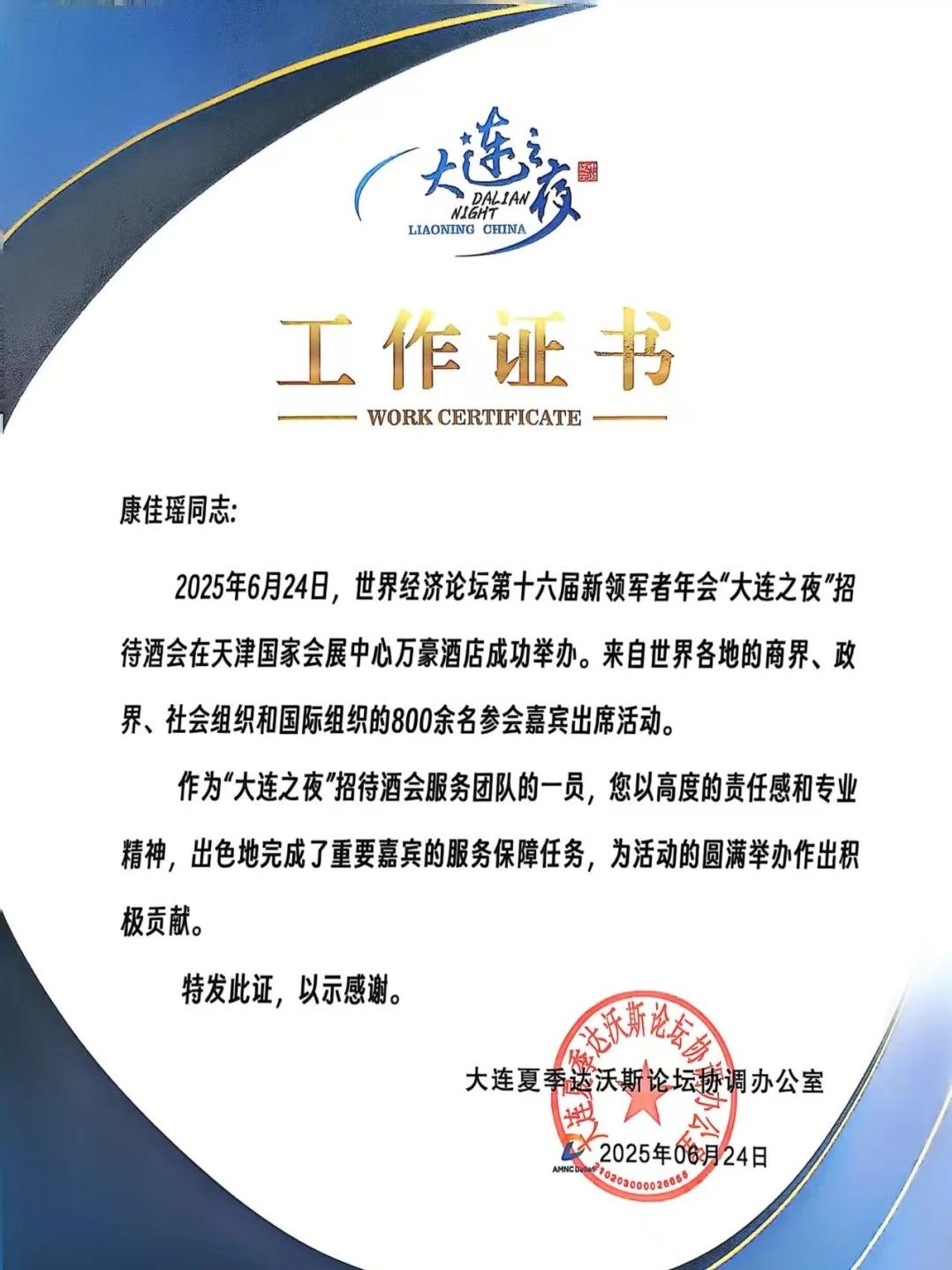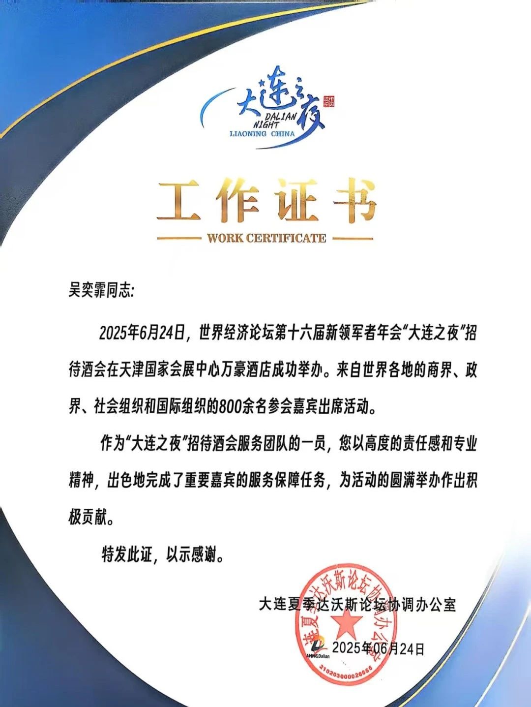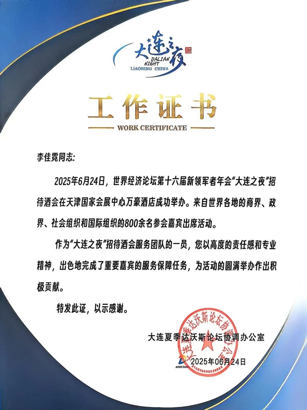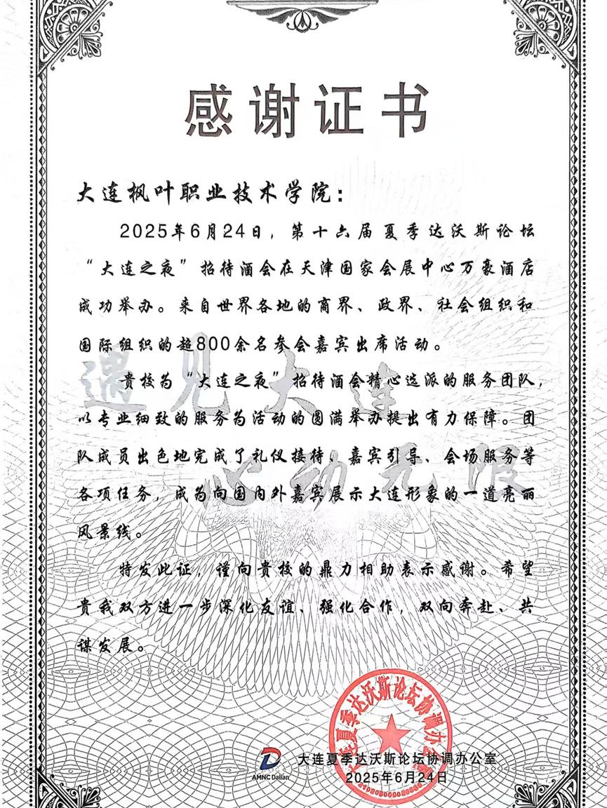 大连夏季达沃斯论坛协调办公室特别向学院发感谢证书,并为每一位同学颁发了个人工作证书,表彰他们“以高度的责任感和专业精神,为活动的圆满举办作出积极贡献”。带队教师李慧欣表示:“这次经历不仅提升了学生的专业实践能力,更开阔了他们的国际视野,是课堂教学与实战锻炼相结合的生动体现。”
