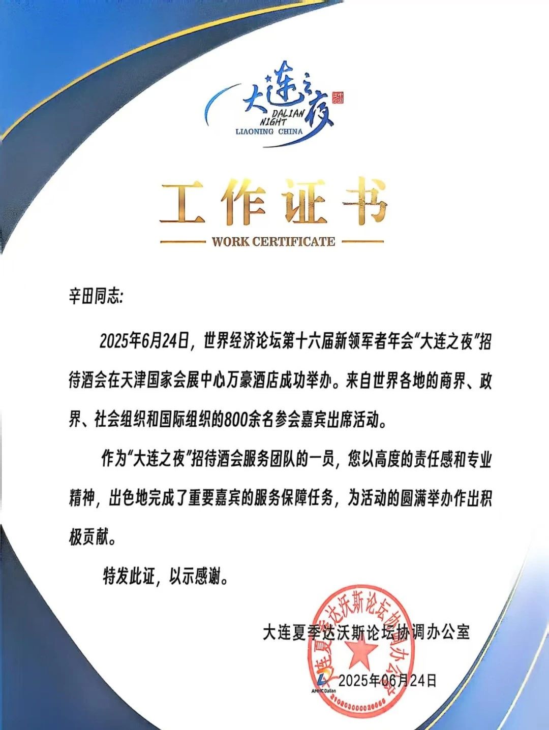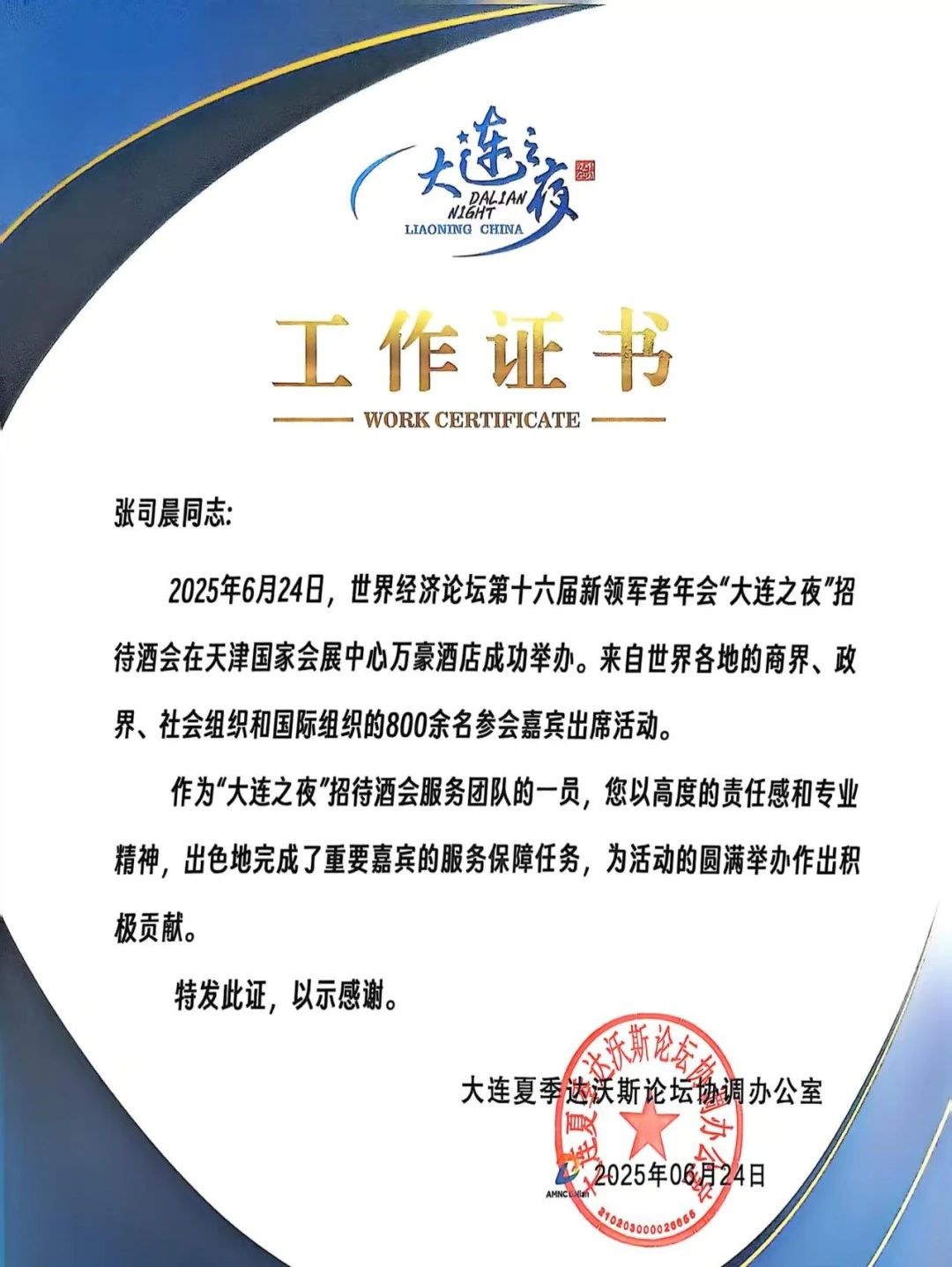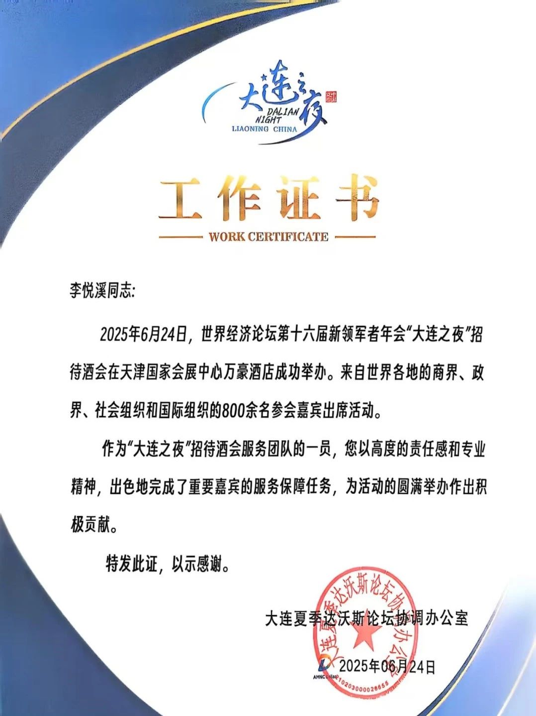 大连夏季达沃斯论坛协调办公室特别向学院发感谢证书,并为每一位同学颁发了个人工作证书,表彰他们“以高度的责任感和专业精神,为活动的圆满举办作出积极贡献”。带队教师李慧欣表示:“这次经历不仅提升了学生的专业实践能力,更开阔了他们的国际视野,是课堂教学与实战锻炼相结合的生动体现。”