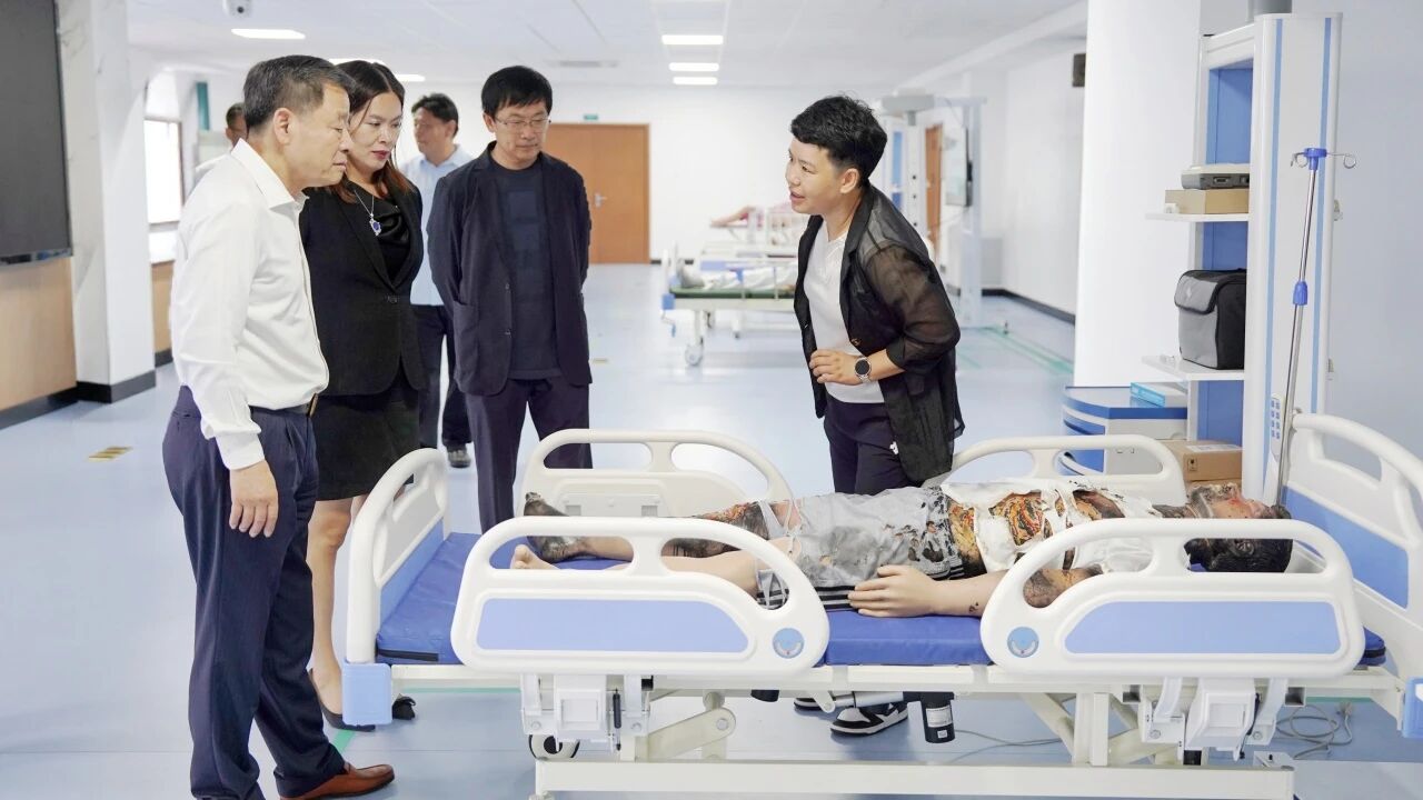 调研期间,王广发董事长一行首先来到我院护理产业学院实训中心。先后参观了模拟病房、仿真实训室等现代化教学设备,体验护理操作设备的使用,详细了解实训课程开展及产教融合情况,对我院现代化的实训条件和实践教学成果给予了高度评价。
