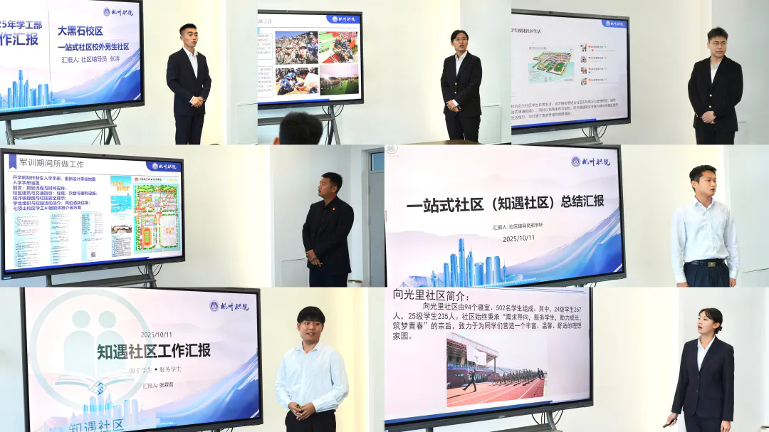 会上,七位社区辅导员依次汇报所在社区阶段性工作成果,从社区管理、队伍建设、思政育人、服务保障等维度,呈现了一站式社区建设的生动实践。在社区精细化管理方面,各社区均构建起“楼长-层长-区域长-寝室长”四级联动机制,实现问题闭环处置,从内务规范、安全管理、寝室报修、矛盾调解、贫困摸排等多方面解决问题,真正做到“事事有记录、件件有回音”。队伍建设与能力提升同步推进,各社区定期组织楼长、区域长选拔与系统培训,如“应急处置+沟通技巧”专项培训等,提升自治队伍服务能力。思政育人与文化建设亮点纷呈,在军训期间,各社区辅导员全程跟训,组织军歌合唱、消防演练、绘画比赛、摄影比赛等活动,有效增强学生社区归属感与家国情怀。