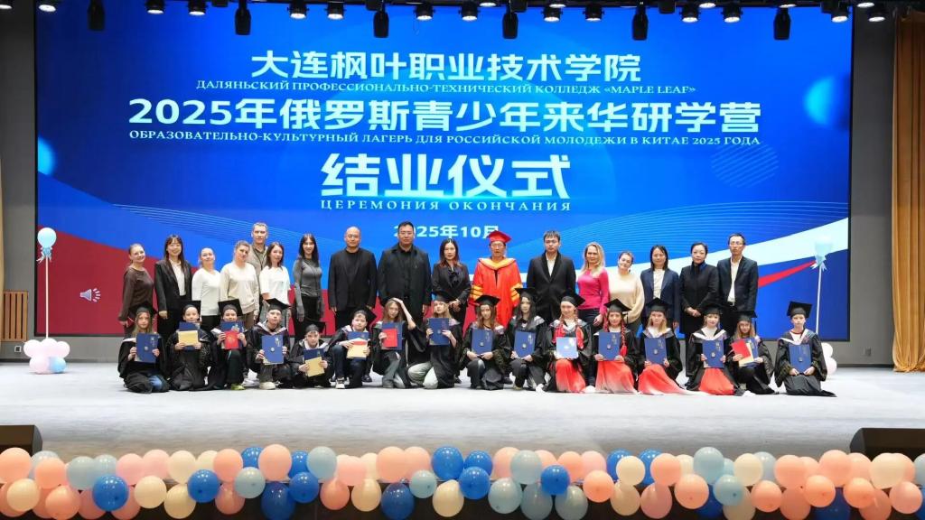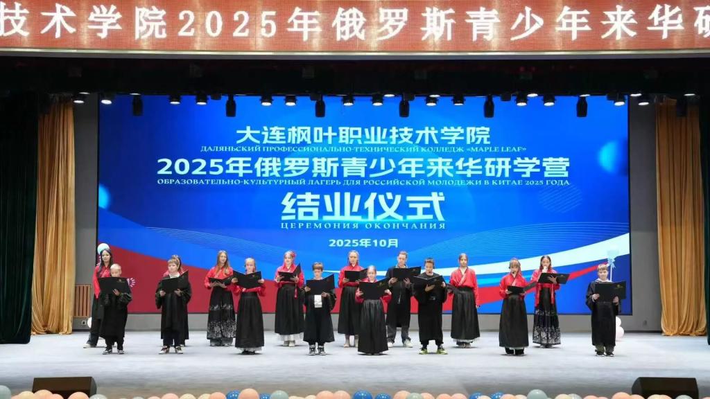 10月24日,大连枫叶职业技术学院七顶山校区图书馆报告厅举行“2025中俄青少年文化交流研学营”结业仪式,标志着为期两周的俄罗斯青少年来华研学活动圆满结束。大连枫叶职业技术学院领导、俄罗斯研学营师生及家长代表出席仪式,共同见证这一中俄教育文化交流的重要成果。
