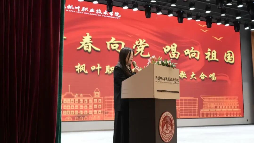 当前奏里的古筝旋律缓缓流淌,舞台灯光渐亮,智能互联网产业学院的枫叶智声队合唱团的同学们身着枫叶职院的校服,轻声唱响“红日升在东方,其大道满霞光”。