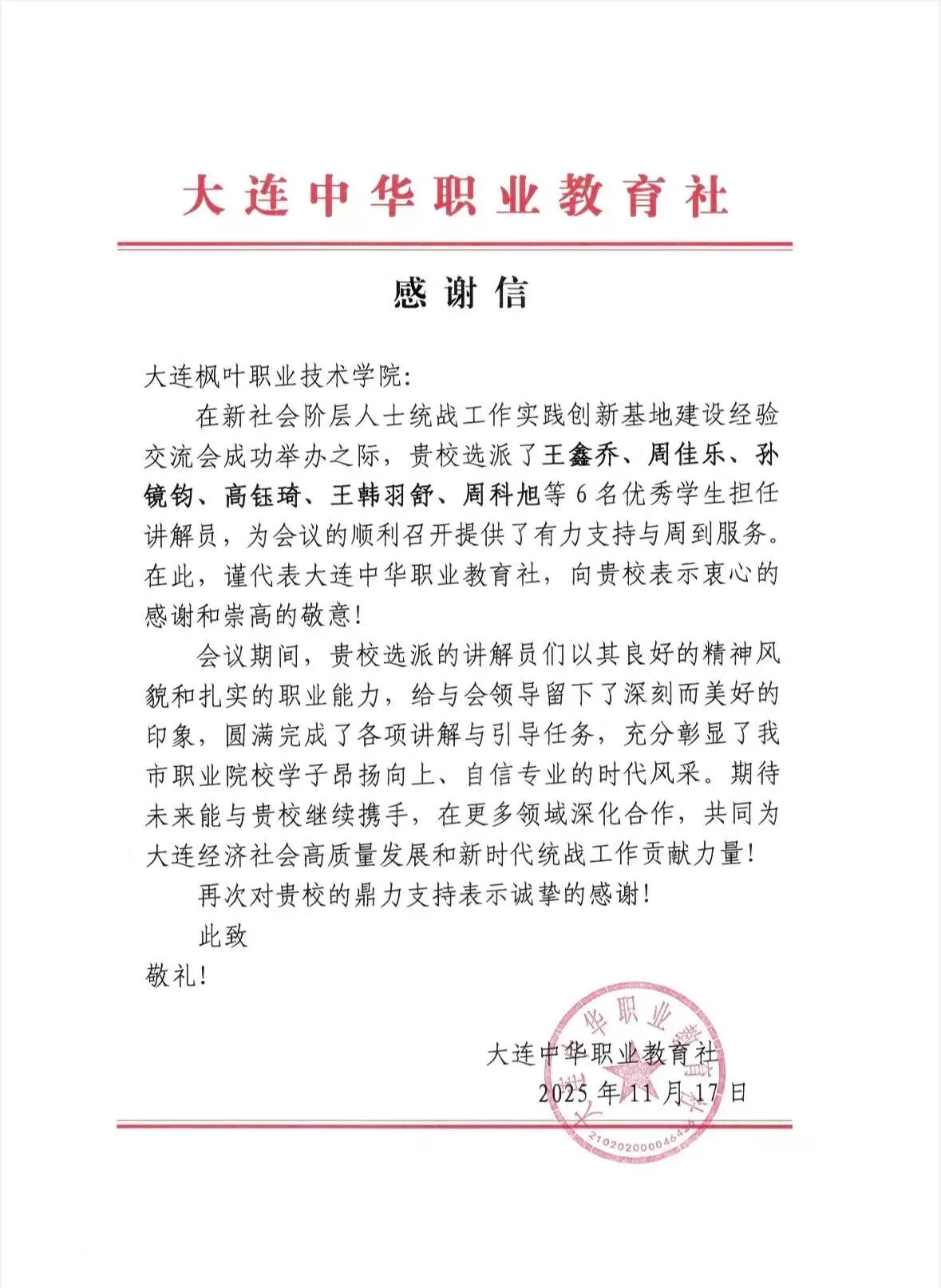 学子们以饱满的精神状态、扎实的专业素养和周到的服务意识,圆满完成各项讲解与引导任务,其出色表现不仅获得大连市委统战部的肯定,更赢得大连中华职业教育社的高度认可。会后,大连中华职业教育社专门向大连枫叶职业技术学院发来感谢信,信中明确指出,学子们的服务“给与会领导留下深刻而美好印象”,充分彰显了大连职业院校学子“昂扬向上、自信专业的时代风采”,并期待未来与学院深化合作,共同为大连经济社会高质量发展与新时代统战工作贡献力量。