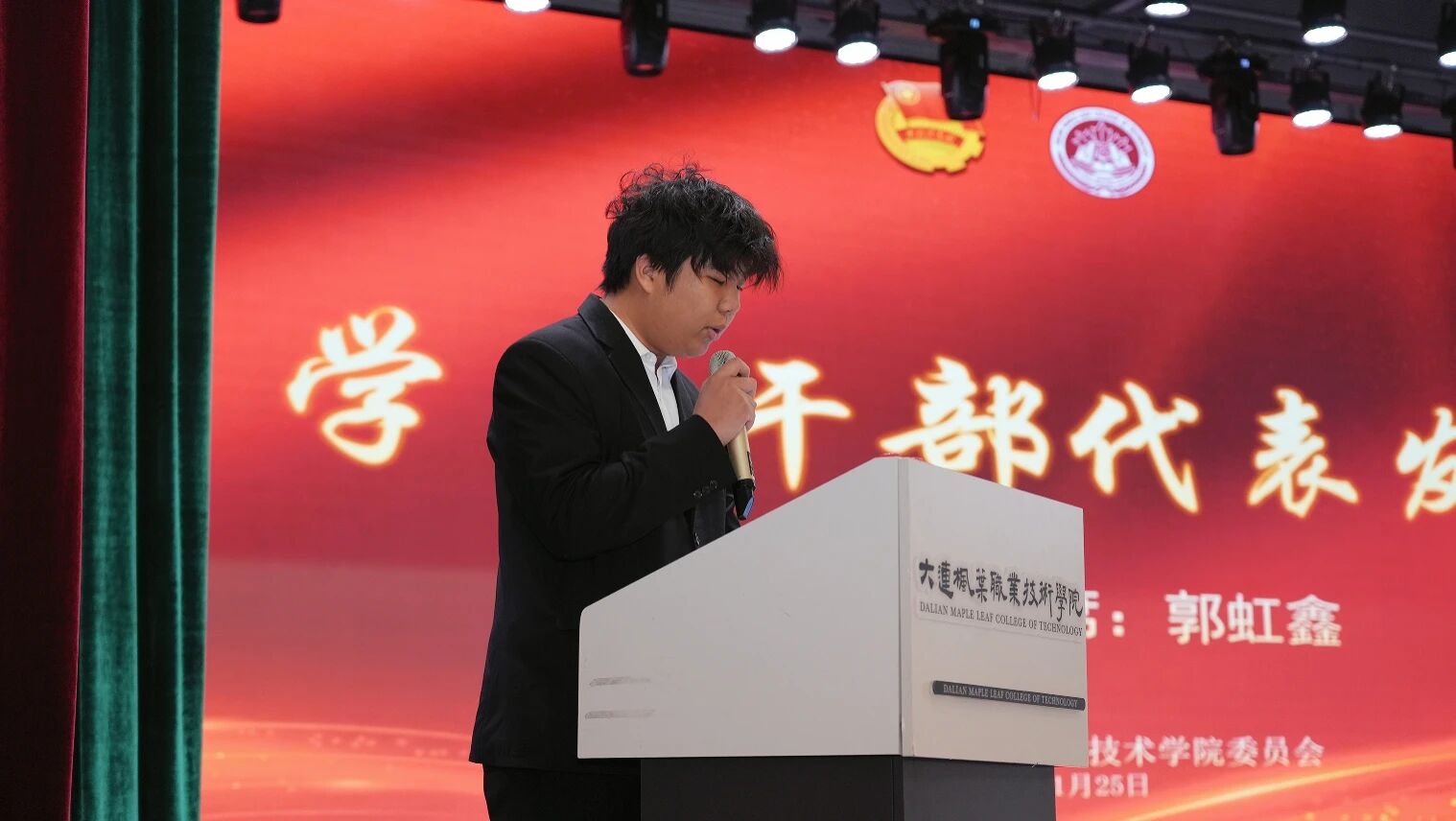 学生干部代表郭虹鑫登台发言,结合自身履职经历分享成长感悟,细数服务师生中的收获与沉淀,同时立足学院发展与青年担当许下坚定展望,言语真挚有力,传递出新时代学生干部的责任与热忱。
