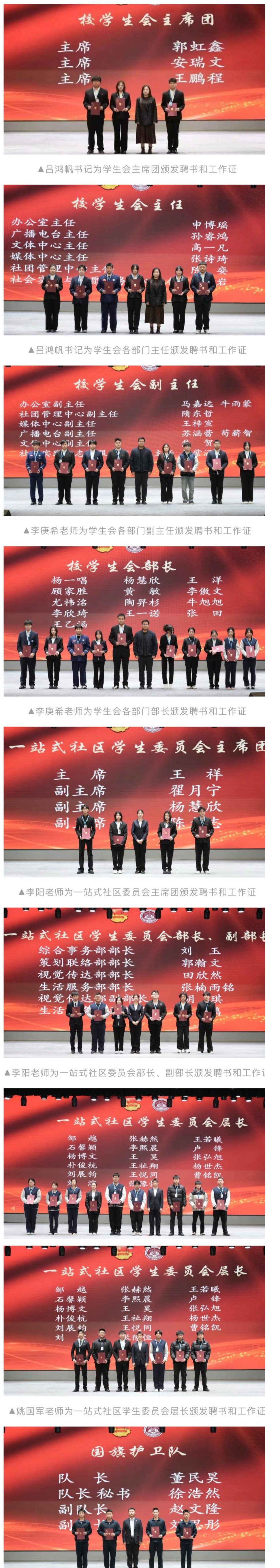 聘任仪式是本次大会的重要环节。聘任名单宣读完毕后,领导老师分批次为校学生会、一站式社区学生委员会、国旗护卫队的学生干部颁发聘书与工作证。一纸聘书承载着责任与荣光,见证着学生干部开启服务同学、奉献校园的新使命。