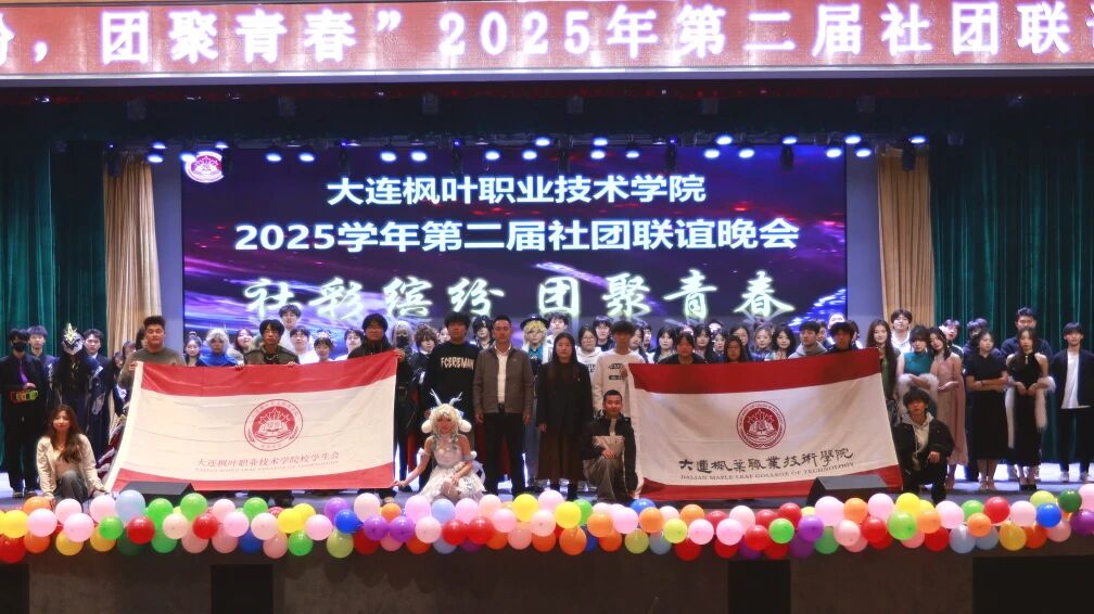 11月27日,大连枫叶职业技术学院七顶山校区报告厅内热闹非凡,以“社彩缤纷·团聚青春”为主题的第二届社团联谊晚会在此盛大举行,为全院师生带来了一场充满青春活力的视听盛宴。