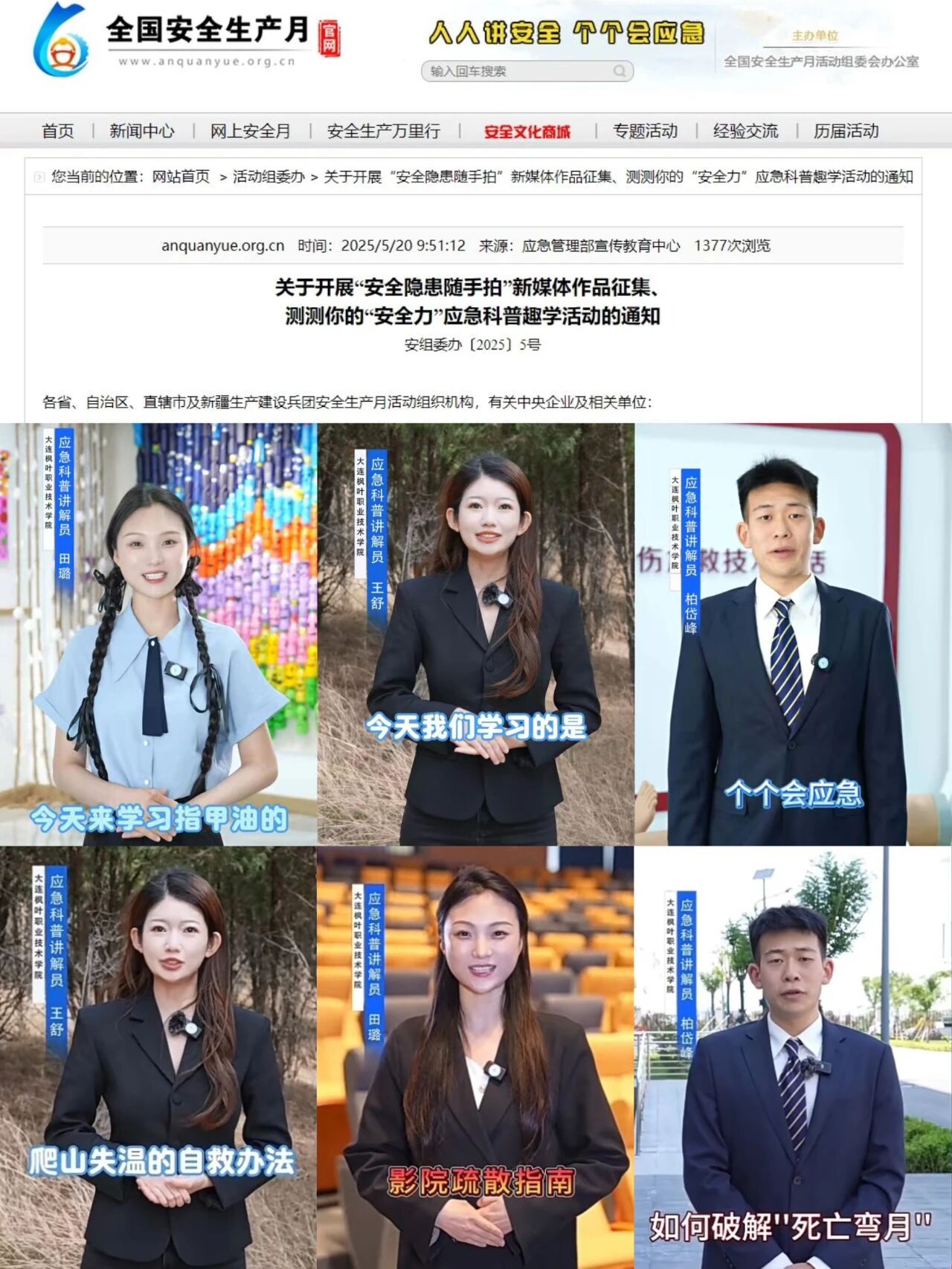 2025年全国“安全生产月”以“人人讲安全,个个会应急——查找身边安全隐患”为主题,我院积极响应应急管理部宣传教育中心号召,精心组织师生团队拍摄应急科普短视频,在小红书平台集中展播。系列作品聚焦校园及日常生活中的常见安全隐患,以生动有趣的形式普及应急避险知识,不仅收获了广泛的社会关注与好评,更为全国应急科普工作注入了鲜活的青春动能。