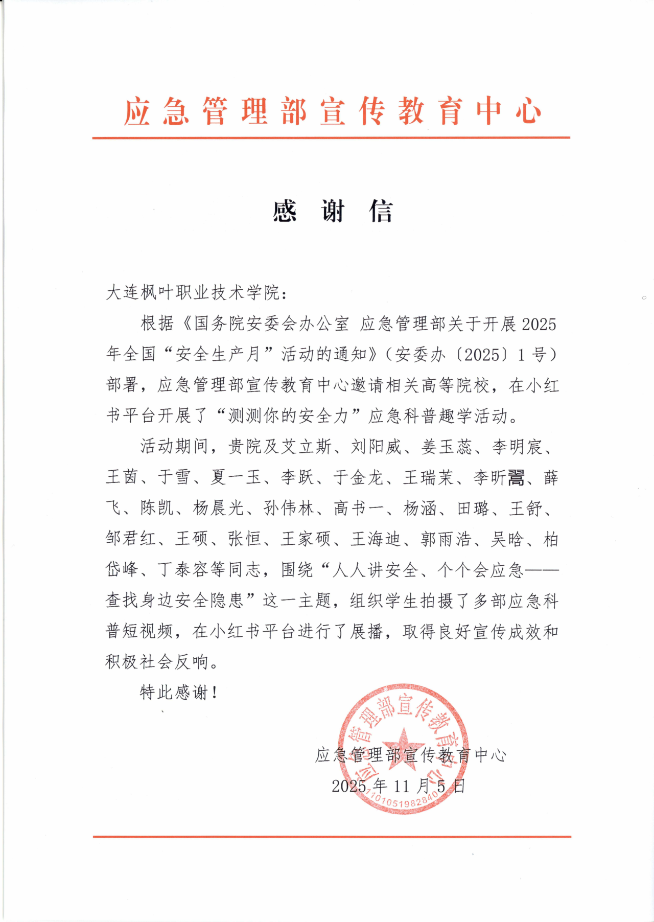 近日,应急管理部向我院发来感谢信,对学院在 2025 年全国 “安全生产月” 期间,积极参与 “测测你的安全力” 应急科普趣学活动的出色表现与良好成效给予高度肯定,并向活动中辛勤付出的 28 位老师、8 位同学致以诚挚谢意。