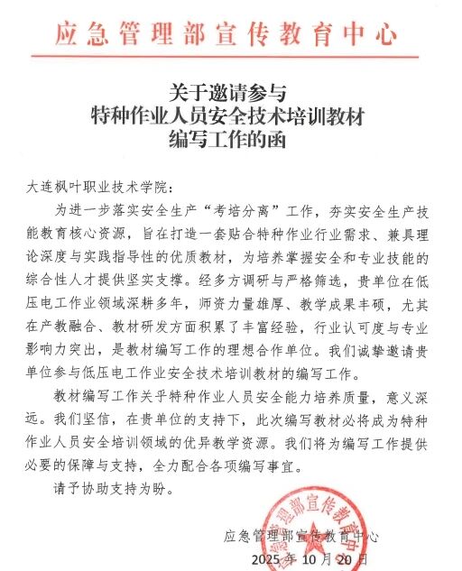 近日,我院收到应急管理部宣传教育中心来函,受邀参与特种作业人员安全技术培训教材编写工作。这一邀约,既是应急管理部宣传教育中心对我院在低压电工作业领域师资力量与教学成果的高度认可,更是对我院多年来深耕职业教育、推进产教融合成果的充分肯定。