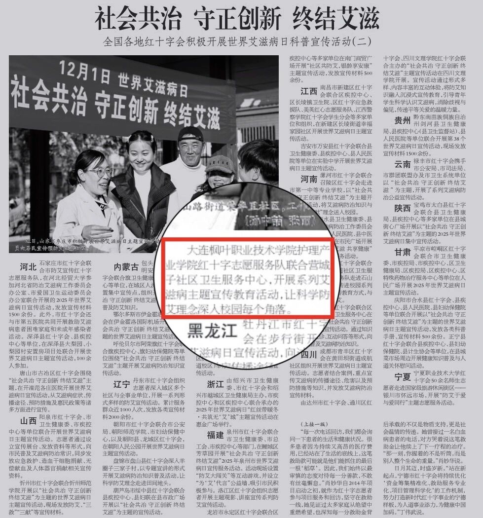 近日,大连枫叶职业技术学院护理产业学院红十字志愿服务队开展的艾滋病防治宣传系列活动,被国家级媒体《中国红十字报》刊登报道。这一荣誉不仅是对该服务队专项公益行动的肯定,更彰显了其深耕志愿服务领域、践行红十字精神的丰硕成果。据悉,除此次国家级媒体报道外,服务队全年开展的各类公益活动还获市级媒体报道6次、省级媒体报道1次,以专业与担当传递青春温暖,社会影响力持续凸显。